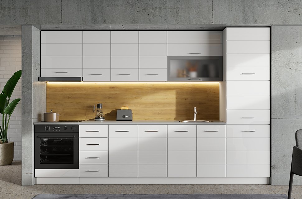 Kuhinja UNA pruža kompletno rešenje za moderne kuhinjske prostore. Sveden dizajn i kombinacija opak belog dekora sa belom ili sivom lak folijom, kao i grafit sivog dekora sa sivom lak folijom - na nekim elementima, stvaraju atraktivan i uredan ambijent. Raspored elemenata omogućava praktičnu organizaciju i lako odlaganje kuhinjskog pribora, dok opcija ugradnje kuhinjske tehnike doprinosi maksimalnoj funkcionalnosti prostora.