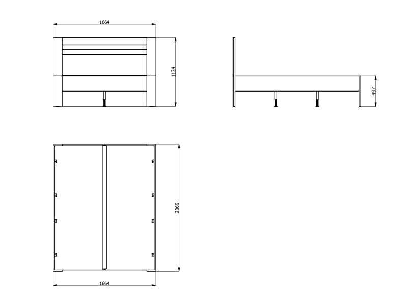 Krevet je dizajniran bez poda i dušeka, predviđen za dušek dimenzija 160 × 200 cm, a upotrebni prostor se može dodatno organizovati kroz jednu fioku, set od dve fioke ili set više fioka, prema individualnim potrebama.