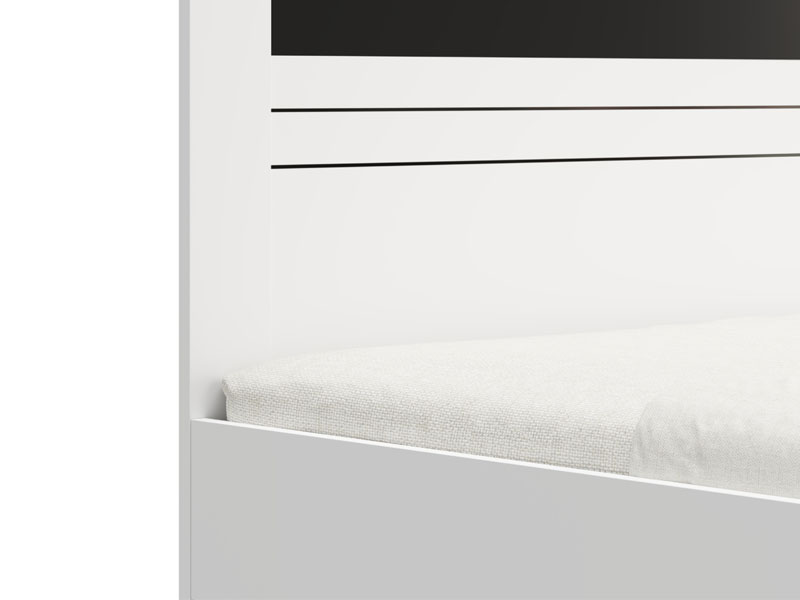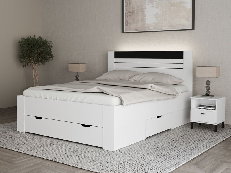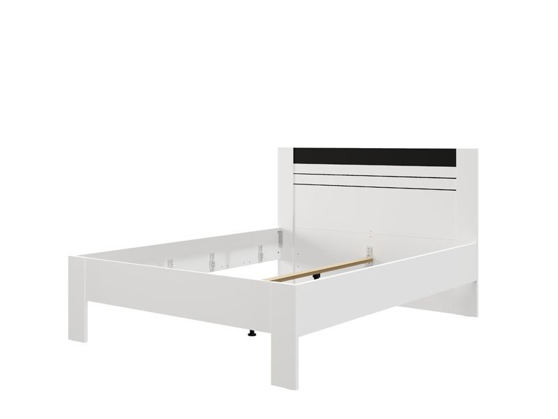 Bračni krevet BITINIA 160, izrađen u kombinaciji opak bela i crnog drvo dekora, doprinosi modernom i elegantnom izgledu spavaće sobe, pružajući stabilnu i funkcionalnu osnovu za odmor.