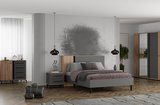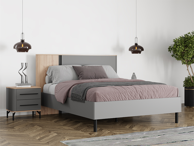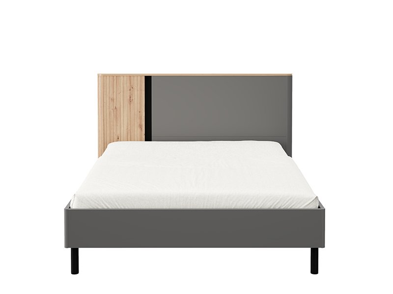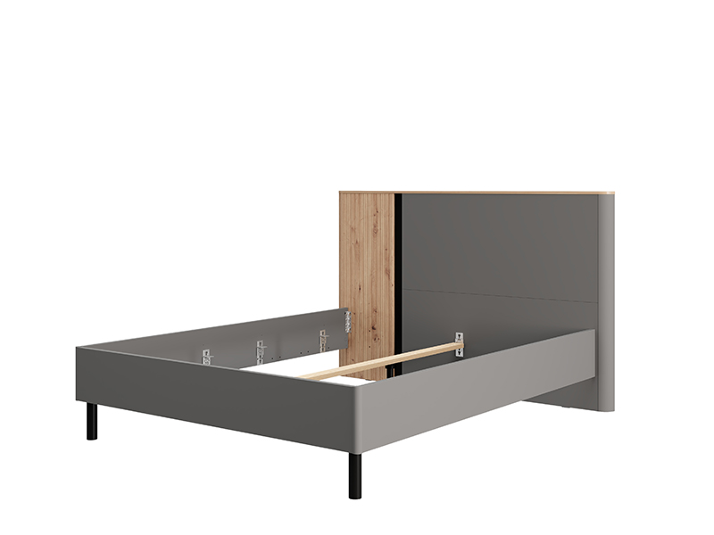 Bračni krevet SINOP 180, izrađen u kombinaciji dekora artisan hrasta, artisan hrast folije, grafit sivog i crnog drvo dekora, doprinosi modernom i sofisticiranom izgledu spavaće sobe, naglašavajući kontrast i jasno definisanu geometrijsku liniju dizajna.