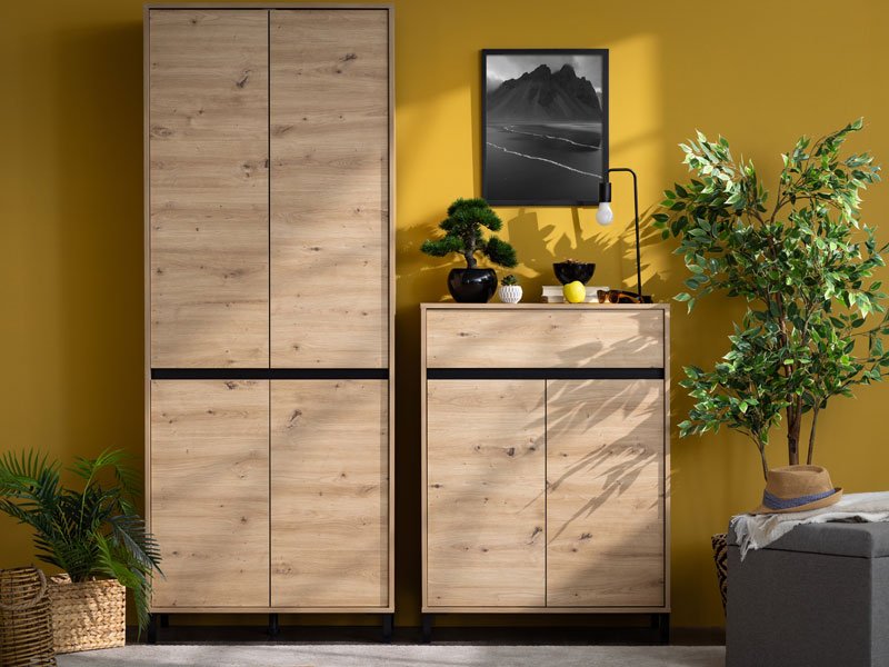 Cipelar FLANNAN 2K4V, u artisan hrast dekoru i detaljima izrađenim od crne mat folije, je moderno i funkcionalno rešenje za odlaganje obuće, koje se može uklopiti i u predsoblja manjih površina, a odgovaraće svakom stilu uređenja doma. Ono što izdvaja ovaj model predsoblja je njegova funkcionalnost. Poseduje 2 dvokrilna zatvorena dela sa policama za odlaganje obuće.