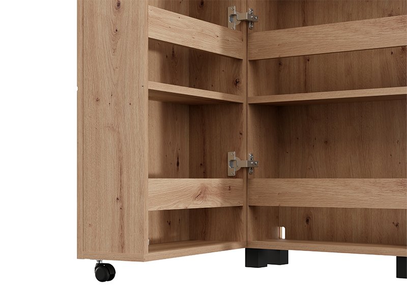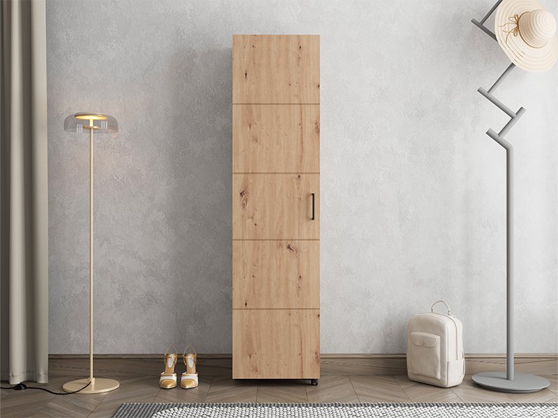 Cipelar ISLAY 46 1K h185, u dekoru artisan hrasta sa hotstamping prugama, praktično je i elegantno rešenje za predsoblje. Unutrašnjost ovog jednokrilnog cipelara sa zatvorenim policama omogućava preglednu i funkcionalnu organizaciju obuće.