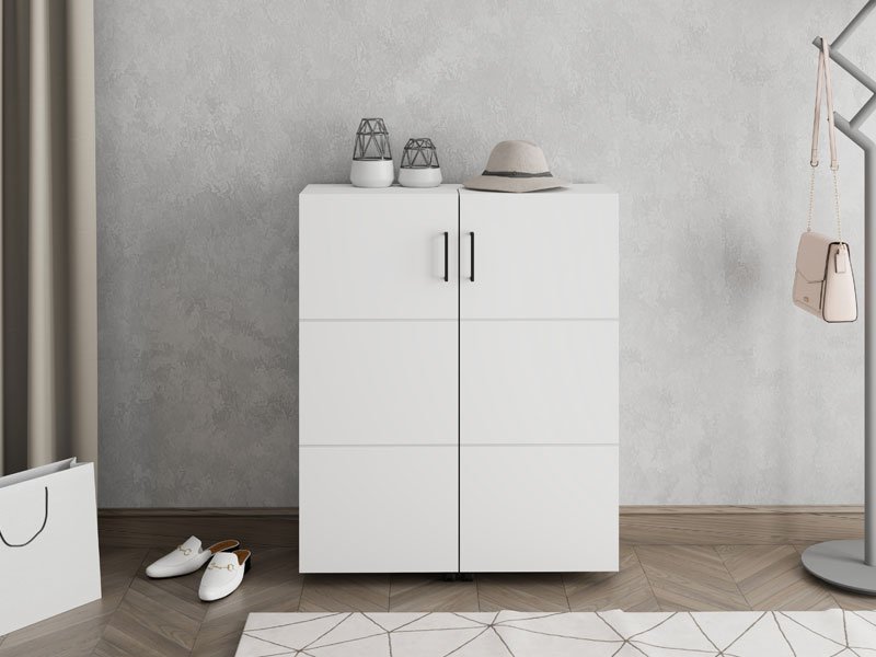 Cipelar ISLAY 91 2K h113, u opak belom dekoru sa hotstamping prugama, praktično je i elegantno rešenje za predsoblje. Unutrašnjost ovo dvokrilnog cipelara, poput komode sa zatvorenim policama, omogućava preglednu i funkcionalnu organizaciju obuće.