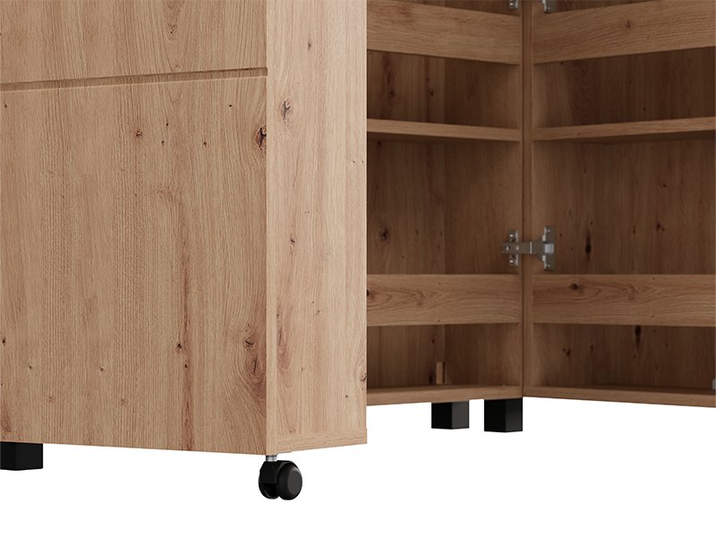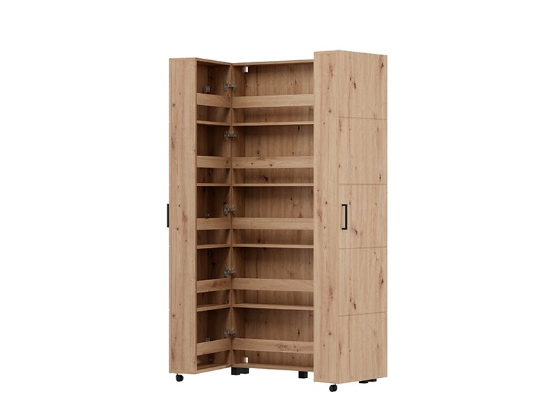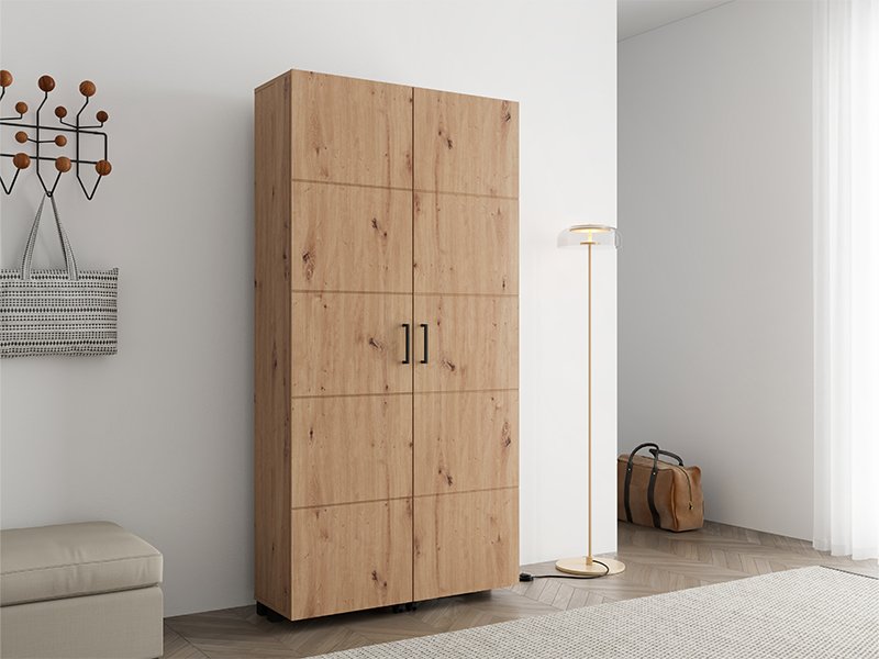 Cipelar ISLAY 91 2K h185, u dekoru artisan hrasta sa hotstamping prugama na frontu, praktično je i elegantno rešenje za predsoblje. Unutrašnjost ovog dvokrilnog cipelara sa zatvorenim policama omogućava funkcionalnu i preglednu organizaciju obuće.