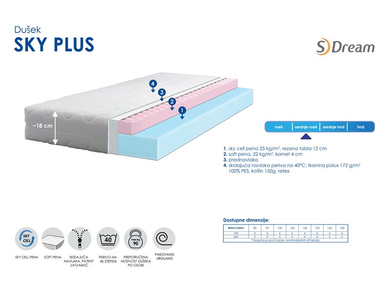 Osnova dušeka SKY PLUS je elastična sky cell pena debljine 12 cm koja stvara optimalne uslove za podršku kičme u ispravnom položaju. Reljefna površina soft pene od 4 cm ima blagi uticaj mikro masaže na telo, poboljšavajući funkcionisanje cirkulacionog sistema. Dušek je visok 18 cm a preporučena nosivost dušeka po osobi je 90 kg i spada u grupu srednje mekih dušeka. Poseduje skidajuću navlaku perivu na 40 stepeni. Dušek se može koristiti za spavanje na obe strane i preporuka je da se okreće na 3 meseca (180 stepeni i rotacija glava- noge). Preporuka proizvođača je da podnica bude od letvica (latoflex ili standardne letvice od masivnog drveta), a da bi se izbegla deformacija jezgra, razmak između letvica ne bi trebalo da bude veći od 8 cm. Ukoliko se kupac ipak odluči za „punu“ ili perforiranu (sa mini otvorima) podnicu od iverice ili lesonita jako je bitno da dušek redovno okreće (180 stepeni i glava-noge). Dostupan u više dimenzija. Naddušek se isporučuje urolan. Dozvoljeno je odstupanje u visini do ±5 mm, u širini i dužini do ±10 mm 48 sati od otvaranja. Ova tolerancija je u skladu sa proizvodnim standardima i ne utiče na udobnost ni kvalitet korišćenja proizvoda. Svaki naddušek koji je isporučen urolan dostiže svoju punu dimenziju 72h od otvaranja.