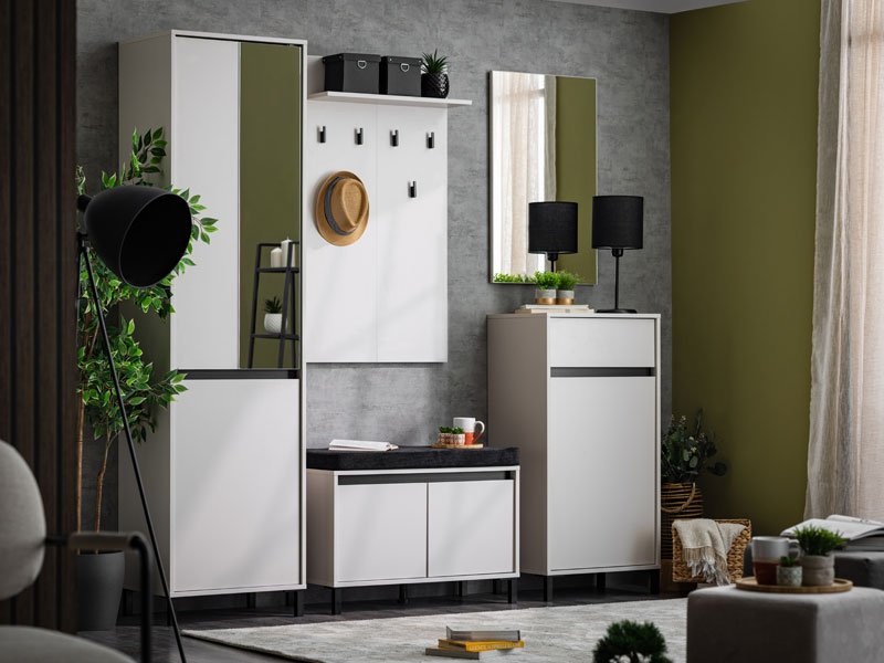 Element predsoblja ARRAN 1K1F, u kašmir dekoru i detaljima izrađenim od crne mat folije, poseduje praktičan zatvoren deo za odlaganje obuće koji se sastoji od krila sa policama, kao i jednu fioku. Može se kombinovati sa drugim elementima kolekcije za predsoblje ARRAN, koji zaokružuju enterijersku priču ulaza u vaš dom.