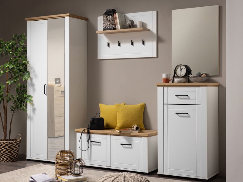 Element predsoblja VALENCIA P2 OG u kombinaciji artisan hrasta, opak bele i bele mat folije, sa ogledalom na jednom krilu, spoj je topline rustičnog šarma i ambijentalne ozbiljnosti, koja dolazi kroz pravilne dizajnerske linije. Frontovi su obogaćeni crnim ručicama jednostavnog dizajna, a koje su usklađene sa dizajnerskom linijom cele kolekcije. Unutrašnjost se sastoji od nosača vešalica i tri police za odlaganje. Deo je istoimenog sistema elemenata za opremanje ambijenta predsoblja, koji odlikuju funkcionalnost i praktičnost kojoj doprinosi kako veliki broj elemenata u sistemu, tako i odlična organizacija prostora za odlaganje.