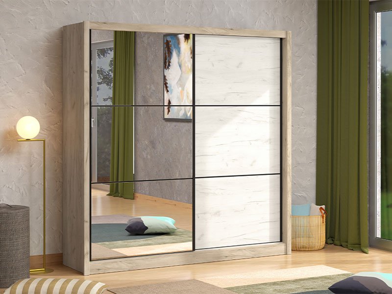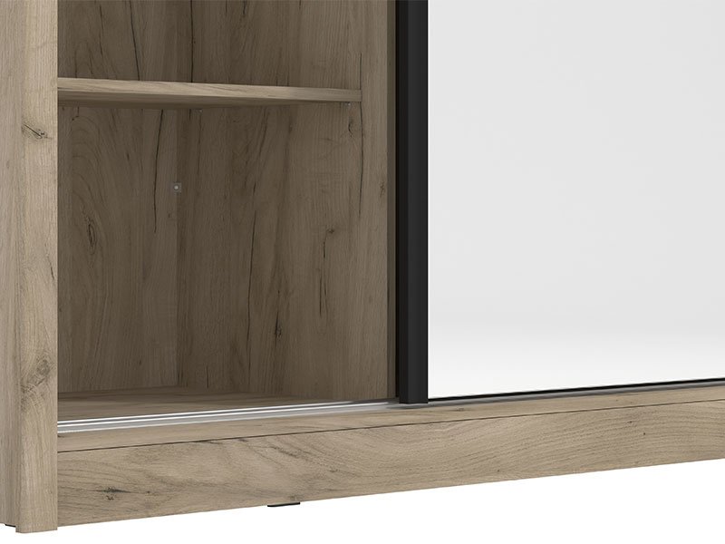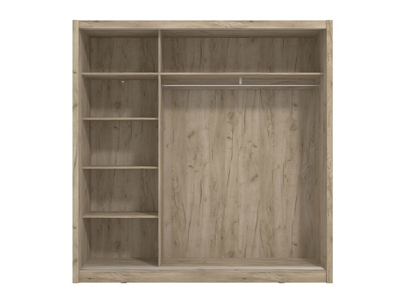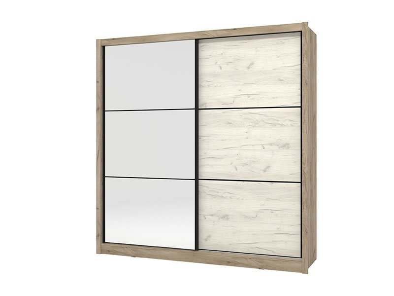Garderober NAVARA 215 OG u dezenu sivog i belog hrasta je moderno dizajnirano i praktično rešenje za odlaganje. Unutrašnjost se sastoji od segmenta sa policama u levom delu i prostranog segmenta sa garderobnom šipkom u središnjem i desnom delu. Poseban benefit ovog modela je klizni mehanizam koji doprinosi ekonomičnoj organizaciji raspoloživog prostora, kao i ogledalo na levom kliznom elementu. Deo je linije NAVARA garderobera, tako da je stilski uklopiv i sa ostalim modelima.