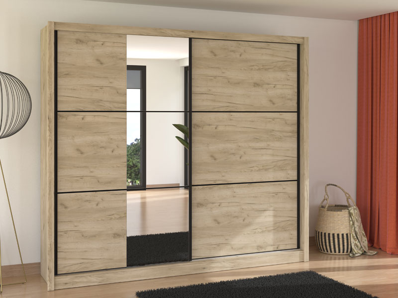 Garderober NAVARA 245 OG u dezenu sivog hrasta je moderno dizajnirano i praktično rešenje za odlaganje. Unutrašnjost se sastoji od segmenta sa policama u levom i desnom delu, kao i segmenta sa garderobnom šipkom u središnjem delu. Poseban benefit ovog modela je klizni mehanizam koji doprinosi ekonomičnoj organizaciji raspoloživog prostora, kao i ogledala smeštenog na centralnom delu garderobera. Deo je linije NAVARA garderobera, tako da je stilski uklopiv i sa ostalim modelima.