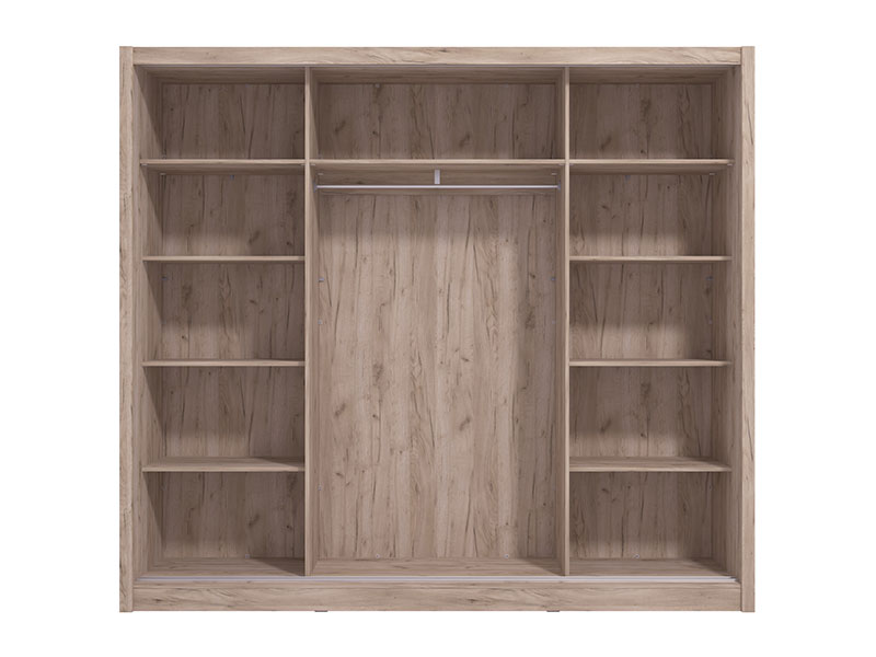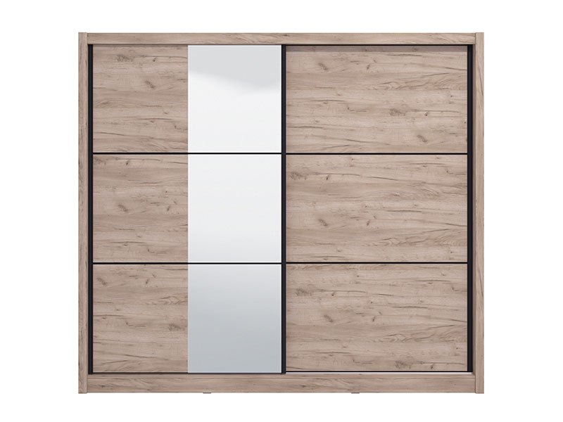 Model garderobera NAVARA 245 OG 2K sa kliznim vratima, u dekoru sivog hrasta, i segmentom sa ogledalom na levom frontu, obećava enterijersku praktičnost i maksimalnu iskorišćenost prostora. Upotrebni prostor ovog modela čine police u levom i desnom delu, kao i garderobna šipke u središnjem delu.
