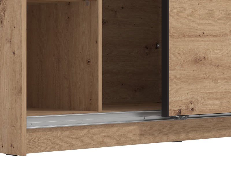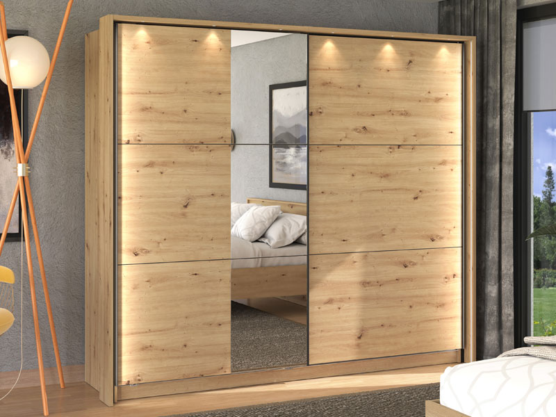 Garderober SIERRA 240 OG u dekoru artisan hrasta predstavlja model garderobera savremenog dizajna i velike praktične upotrebne vrednosti. Unutrašnjost se sastoji od segmenta sa policama u levom i desnom delu, kao i segmenta sa garderobnom šipkom u središnjem delu. Poseban benefit ovog modela je klizni mehanizam koji doprinosi ekonomičnoj organizaciji raspoloživog prostora, kao i ogledalo na polovini levog kliznog elementa koje ima i funkcionalnu i estetsku vrednost. Poseduje mogućnost ugradnje usporivača kod kliznog mehanizma koji dodatno doprinose sigurnosti i funkcionalnosti.