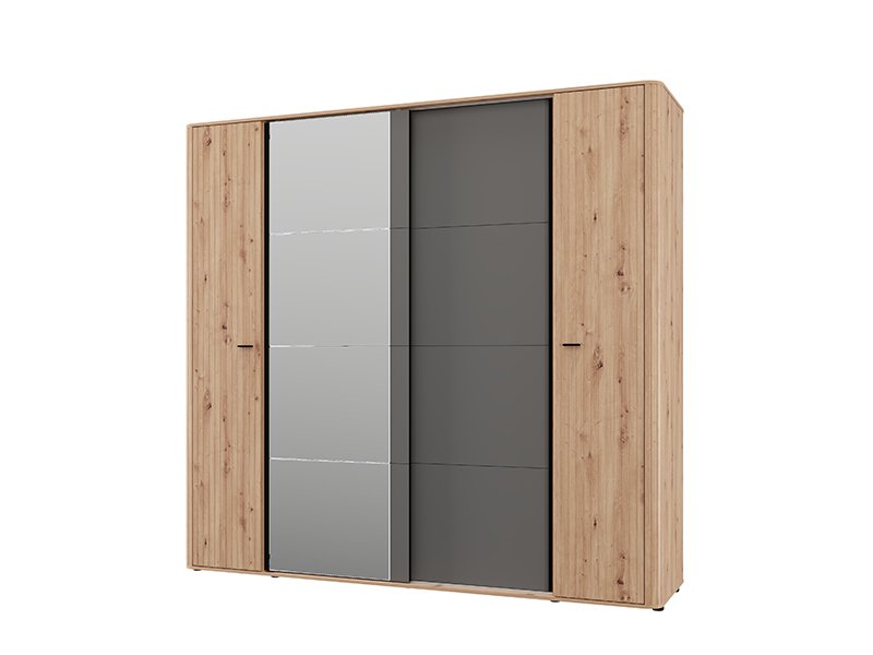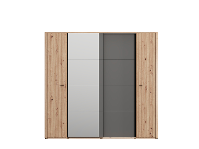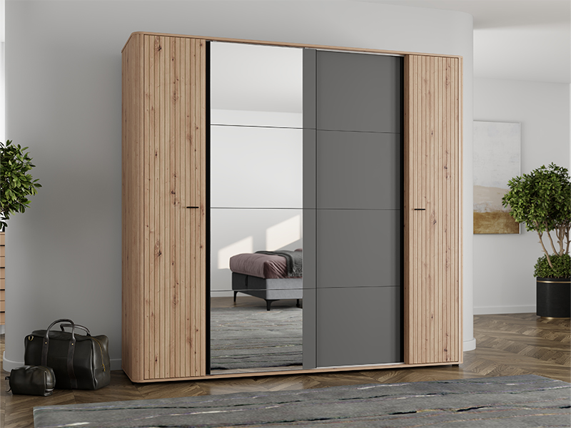 Garderober SINOP 150 KL2K OG h217, izrađen u kombinaciji dekora artisan hrasta, artisan hrast folije, grafit sivog i crnog drvo dekora, doprinosi modernom i sofisticiranom izgledu spavaće sobe, naglašavajući kontrast i jasno definisanu geometrijsku liniju dizajna.
