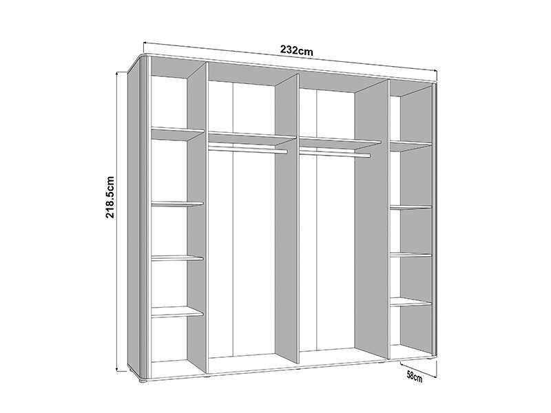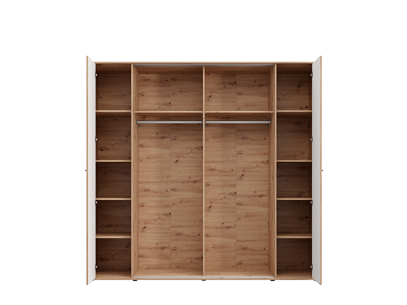Upotrebni prostor garderobera čine dve garderobne šipke i dva pregradna dela, što omogućava pregledno i praktično odlaganje garderobe i sitnih predmeta. Jedan od frontova opremljen je ogledalom, koje dodatno unapređuje funkcionalnost i vizuelno proširuje prostor.