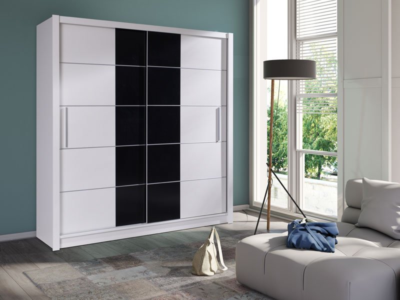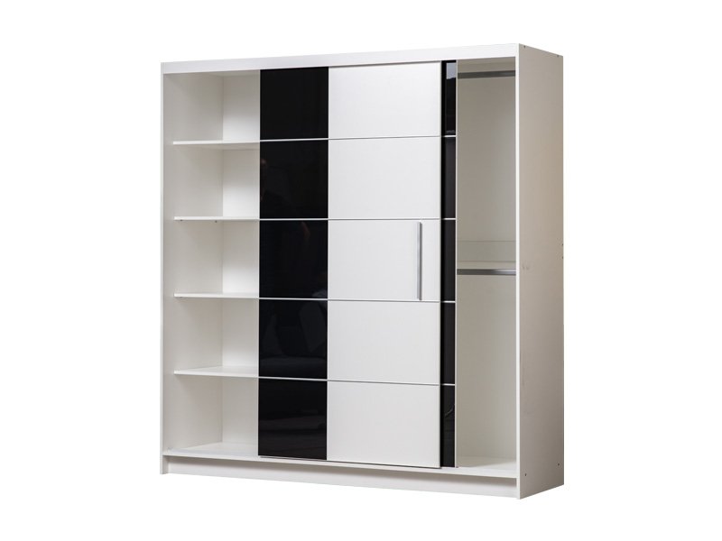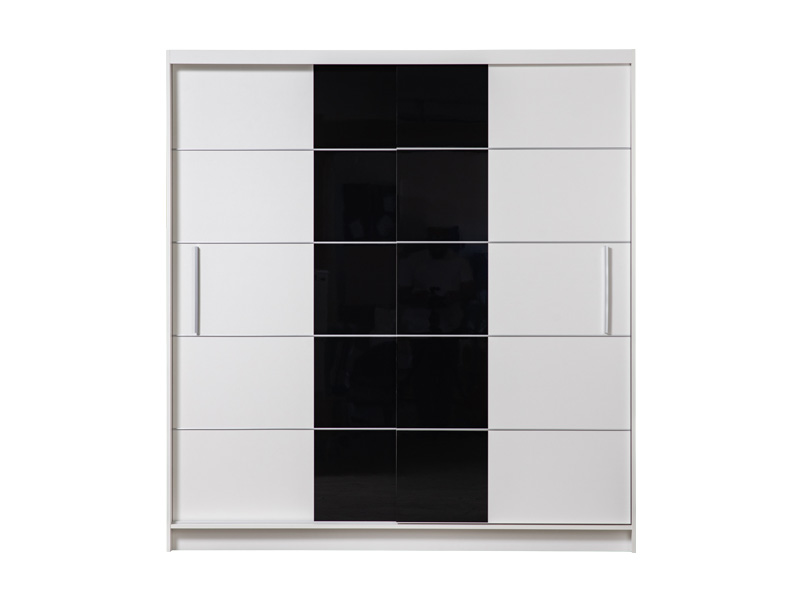 Tačan naziv dezena je: korpus iverica bela PB0010, front iverica bela PB0010 crna. Klizni garderober BARI M savremenog dizajna i praktične forme, u vaš dom uneće dozu elegenacije i minimalizma. Upotrebni prostor u jednom delu raspolaže garderobnom šipkom, dok se u drugom nalaze police za odlaganje.