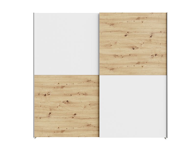 Tačan naziv dezena: korpus iverica bela, front iverica bela/artisan hrast. Model kliznog garderobera ŠAH 200 obećava enterijersku praktičnost i maksimalnu iskorišćenost prostora sa garderobnom šipkom i nosećom policom. Raspored dekora na frontovima se može odabrati prilikom montaže.