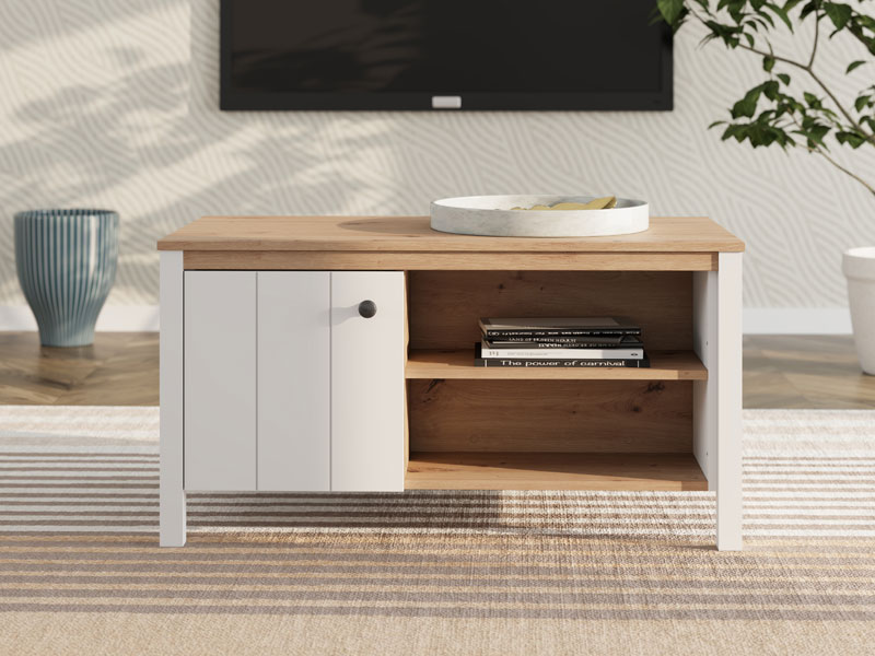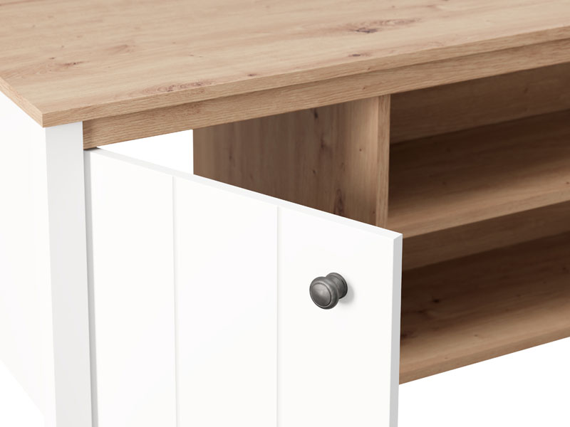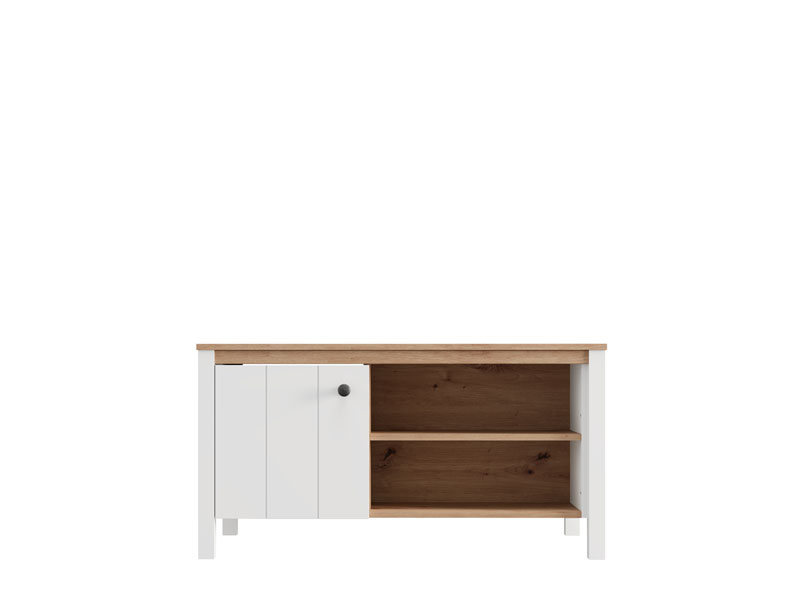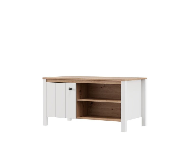 Klub sto BEDFORD KS 2V u kombinaciji opak belog dekora, artisan hrasta, bele mat folije i artisan hrast folije unosi u prostor toplinu, eleganciju i prirodan šarm. Upotrebni prostor čini pregradni deo sa dvostranim zatvaranjem, kao i polica ispod radne površine, koji omogućavaju praktično i organizovano odlaganje predmeta. Klub sto BEDFORD KS 2V je deo sistema elemenata BEDFORD, koji odlikuje spoj rustične estetike i funkcionalnog, modernog dizajna.
