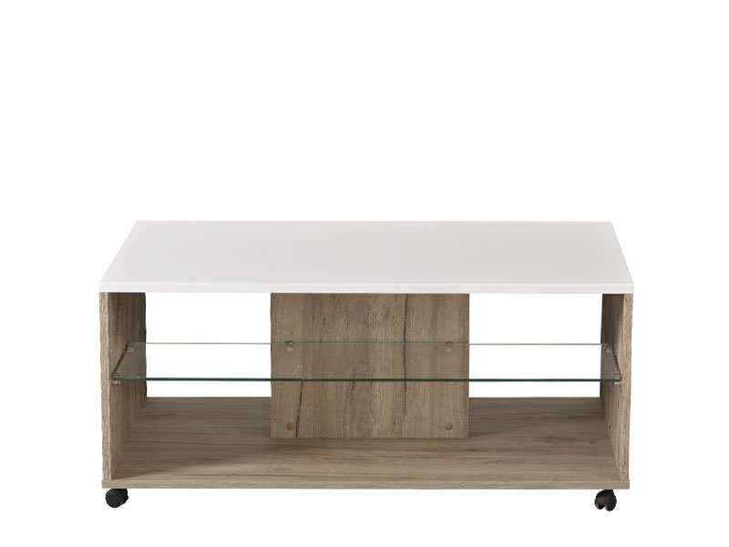 Klub sto BERT, u sivom hrast dezenu sa belom lak folijom, poseduje praktične i estetske efektne staklene police ispod radne površine pogodne za odlaganje omiljenih knjiga ili časopisa. Deo je istoimene kolekcije koja donosi savremen tematski koncept uređenja dnevnog boravka.