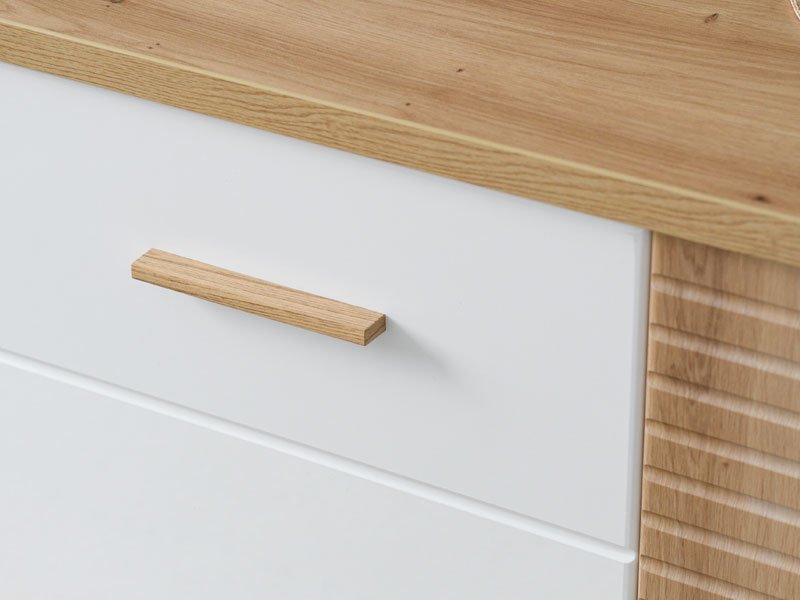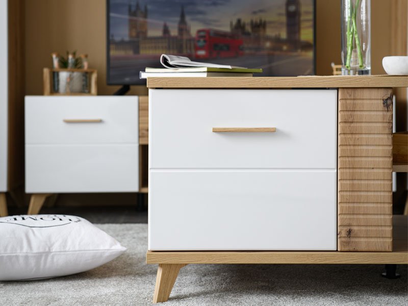 Klub sto BRETAGNA je sjajan funkcionalni dodatak za uređenje ambijenta dnevnog boravka. Kombinacija dekora artisan hrasta sa segmentima u dekoru bele lak folije unosi osvežavajuću estetiku u ambijent. Drvene ručice povezuju dekore u jednu estetsku celinu, dok visoki nogari ističu njihovu eleganciju.