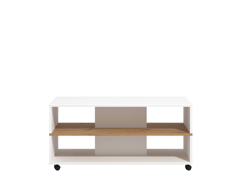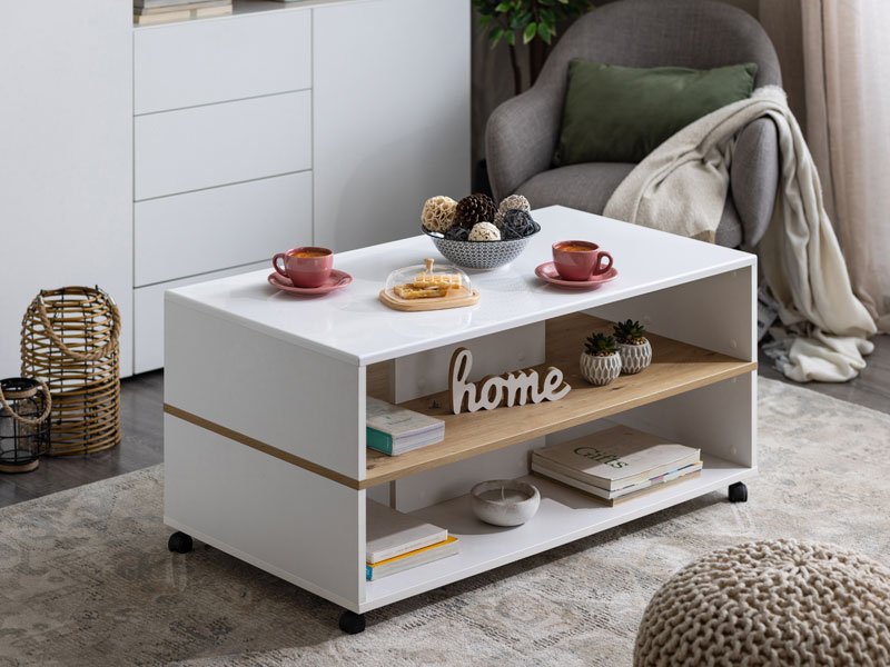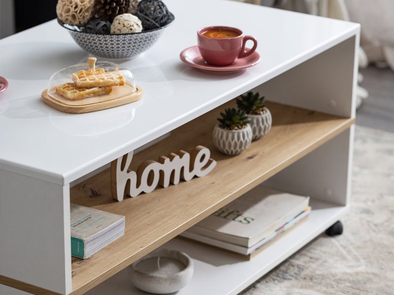 Klub sto SAVIO, u kombinaciji opak belog dekora, dekora artisan hrasta i bele lak folije, poseduje praktične i estetske benefite. Dominantan detalj u izgledu ovog klub stola je efektna polica u kontrastnom dekoru ispod radne površine, pogodna za odlaganje omiljenih knjiga ili časopisa. Klub sto SAVIO doprinosi savremenom tematskom konceptu uređenja dnevnog boravka.