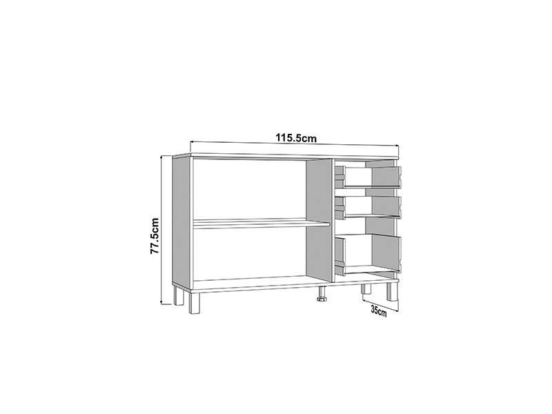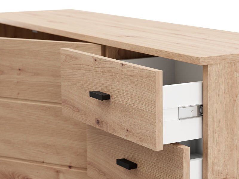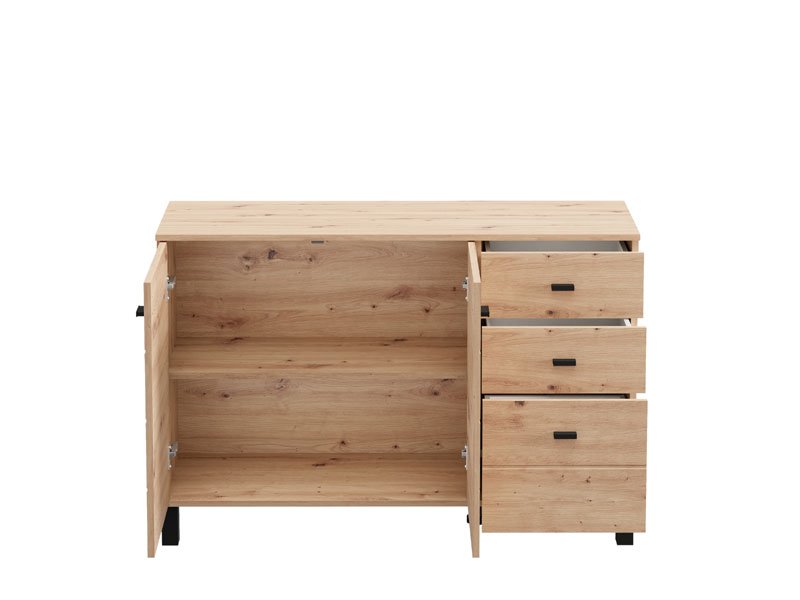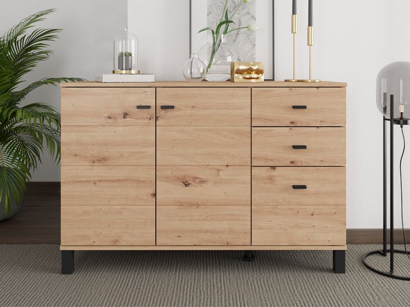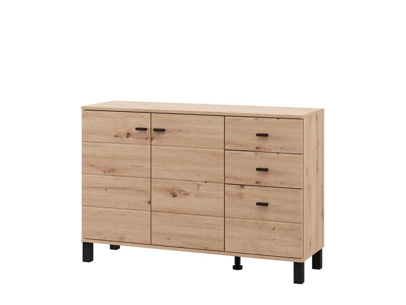 Komoda ALMOND 115 3K3F2V, u dekoru artisan hrasta, unosi toplinu i prirodnu notu u prostor, uz jednostavan i savremen dizajn koji se lako uklapa u različite enterijere. Trokrilna forma obezbeđuje funkcionalno organizovan upotrebni prostor, koji čine dva zatvorena pregradna dela, kao i tri fioke – dve pliće za sitnije predmete i jedna dublja za odlaganje većih stvari. Zahvaljujući praktičnom rasporedu i prijatnom drvo dekoru, komoda ALMOND 115 3K3F2V idealan je izbor za dnevnu zonu, spavaću sobu ili predsoblje, gde kombinuje funkcionalnost i toplinu enterijera.