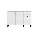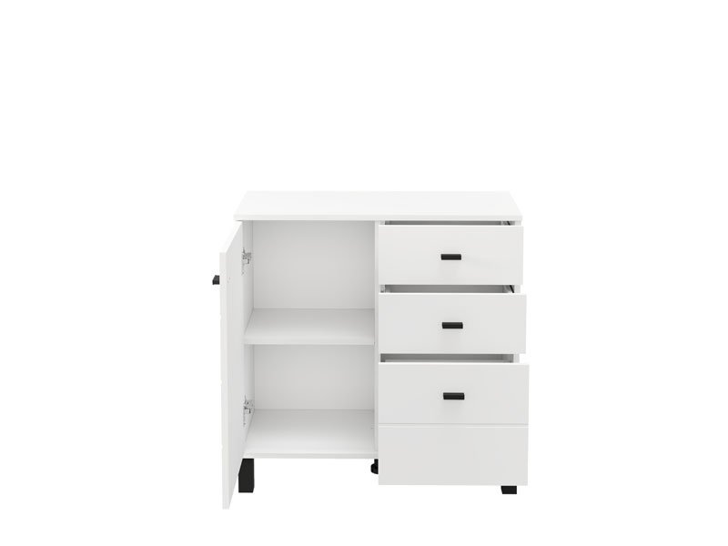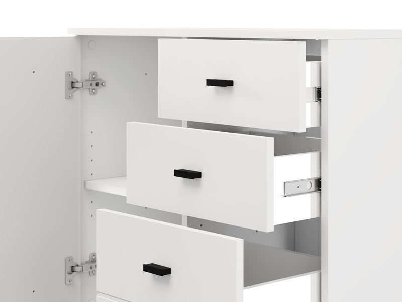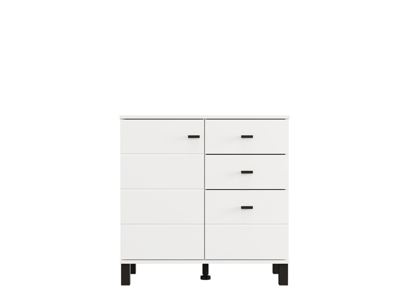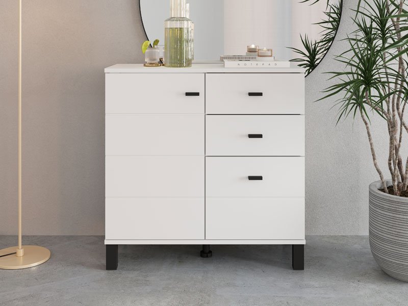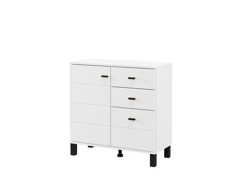 Komoda ALMOND 77 2K3F1V, u opak belom dekoru, odlikuje se kompaktnim dimenzijama i funkcionalnim rasporedom elemenata. Dvokrilna forma omogućava pregledno organizovan upotrebni prostor koji čine jedan zatvoreni pregradni deo, kao i tri fioke – dve pliće namenjene sitnicama i jedna dublja za odlaganje većih predmeta. Zahvaljujući neutralnoj estetici i praktičnosti, komoda ALMOND 77 2K3F1V je pogodna izbor za predsoblje, spavaću sobu ili manji dnevni prostor.