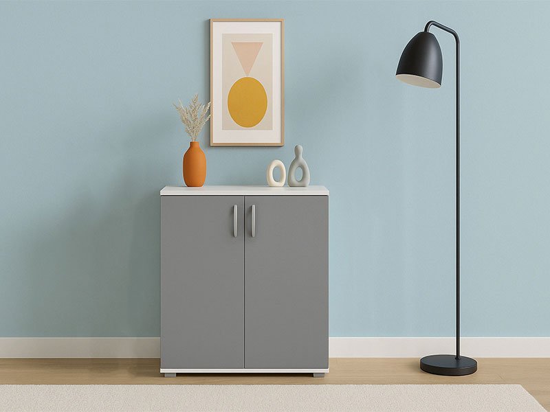 Tačan naziv dezena: korpus iverica bela, front iverica antracit. Komoda ALTA 2V se sastoji od zatvorenog pregradnog dela smeštenog u dva krila. Zahvaljujući praktičnosti lako se uklapa u sve ambijente savremenog doma.