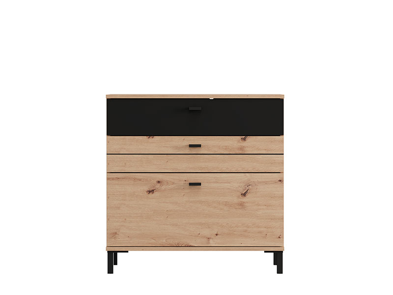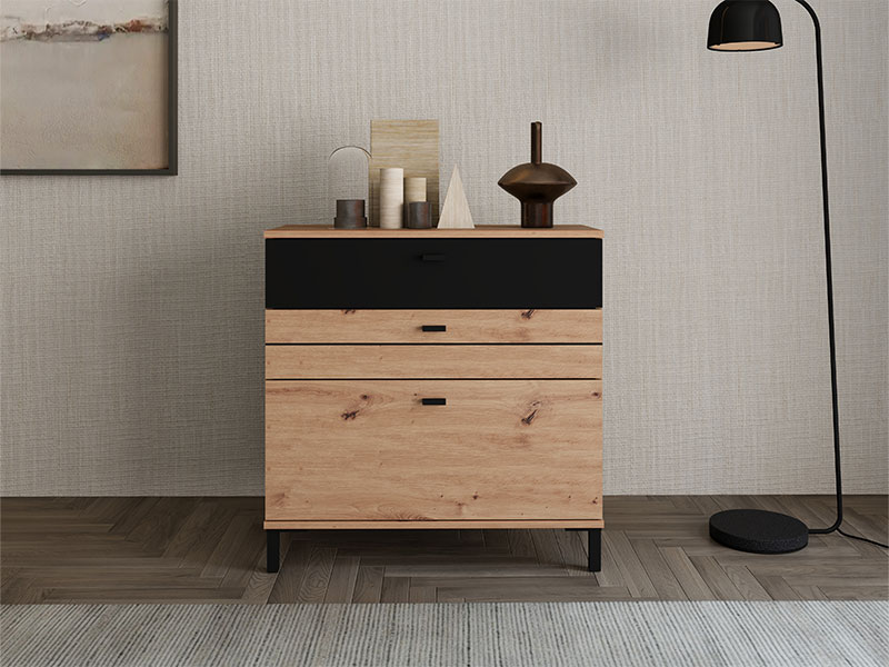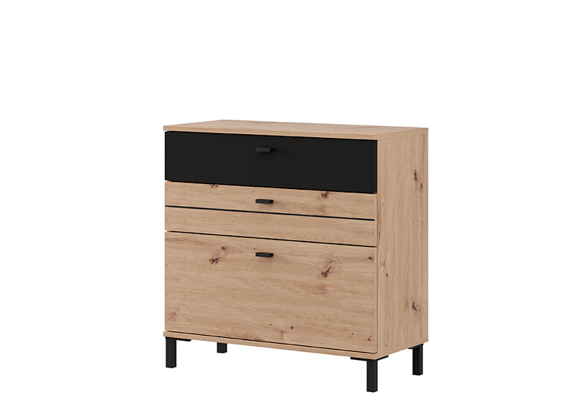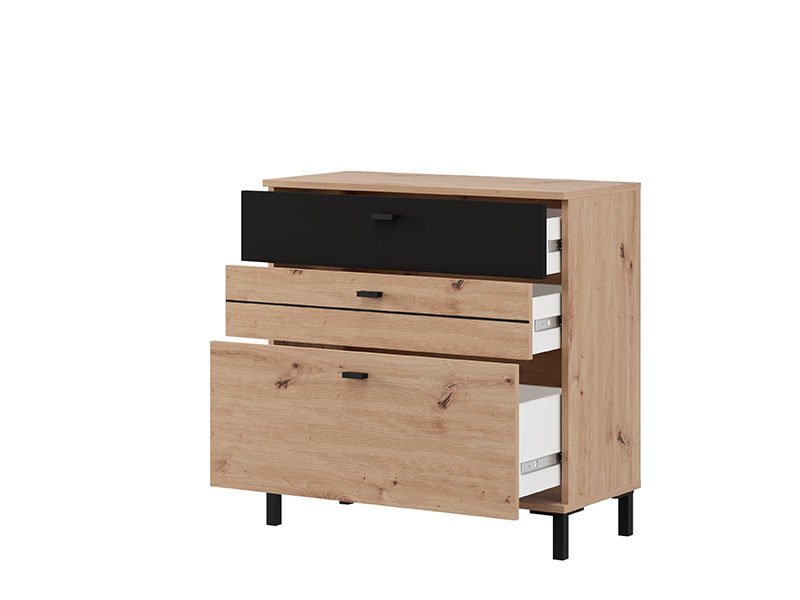 Komoda BITINIA 77 3F, izrađena u kombinaciji artisan hrasta i crnog drvo dekora, doprinosi toplom i modernom izgledu spavaće sobe, naglašavajući skladan kontrast i praktičnost enterijera.