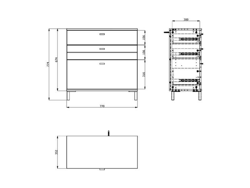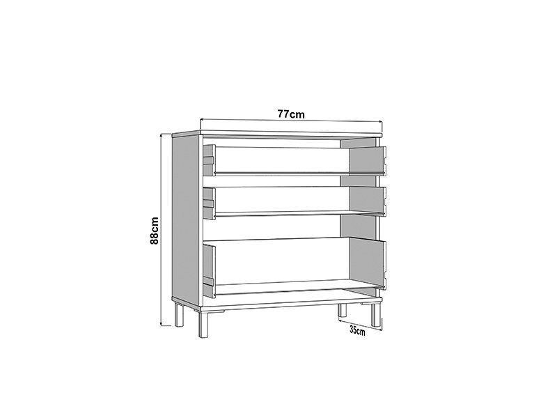 Upotrebni prostor komode čine tri prostrane fioke – dve pliće i jedna duboka, koje omogućavaju pregledno i praktično odlaganje garderobe i sitnih predmeta.