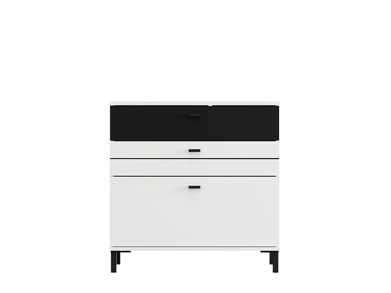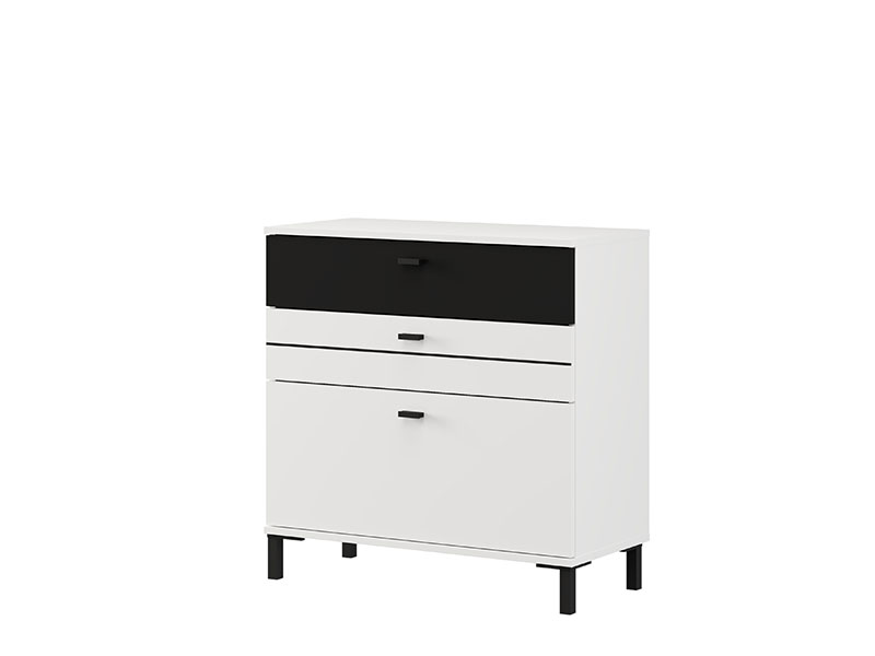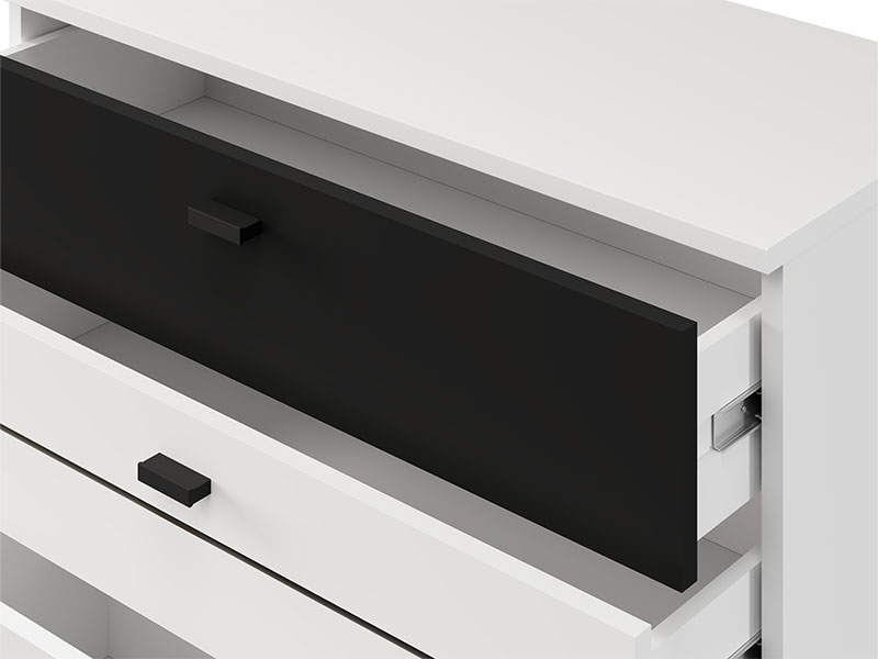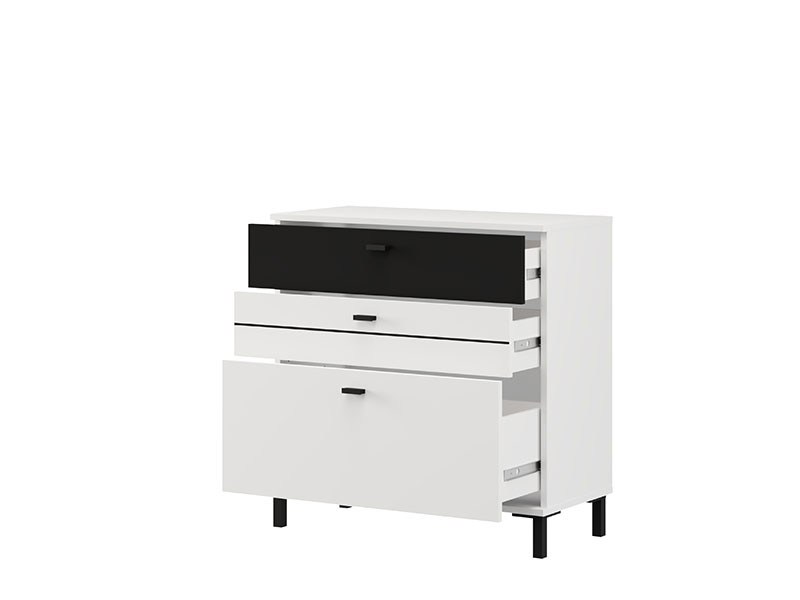 Komoda BITINIA 77 3F, izrađena u kombinaciji opak bela i crnog drvo dekora, doprinosi modernom i elegantnom izgledu spavaće sobe, naglašavajući upečatljiv kontrast materijala i funkcionalnost enterijera.