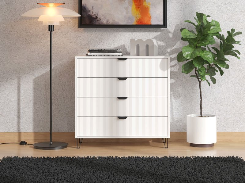 Komoda BREST 4F, u kombinaciji opak belog dekora i bele mat folije dizajnirana je tako da zahvaljujući upotrebnom prostoru koji obezbeđuju četiri prostrane fioke, spada u elemente sa velikom upotrebnom vrednošću. Komoda BREST 4F je pogodna za opremanje predsoblja, dnevne zone, dečije ili spavaće sobe.