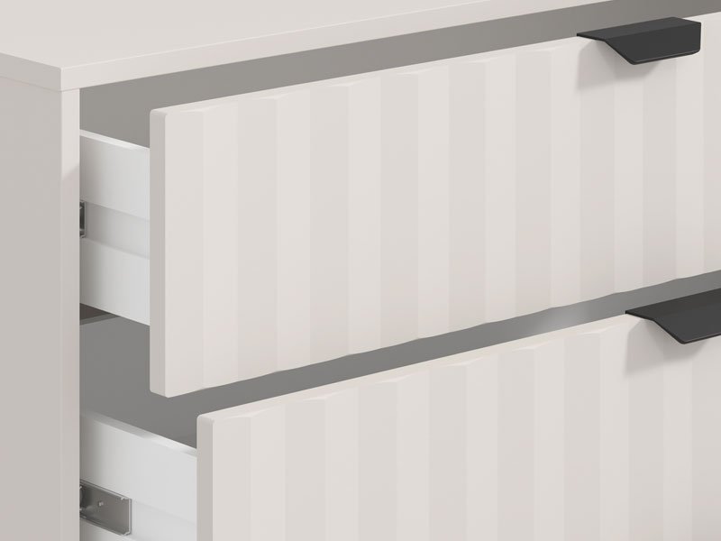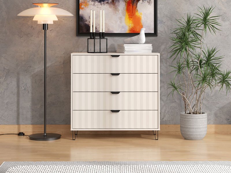 Komoda BREST 4F, u kombinaciji dekora kašmira i kašmir mat folije dizajnirana je tako da zahvaljujući upotrebnom prostoru koji obezbeđuju četiri prostrane fioke, spada u elemente sa velikom upotrebnom vrednošću. Komoda BREST 4F je pogodna za opremanje predsoblja, dnevne zone, dečije ili spavaće sobe.