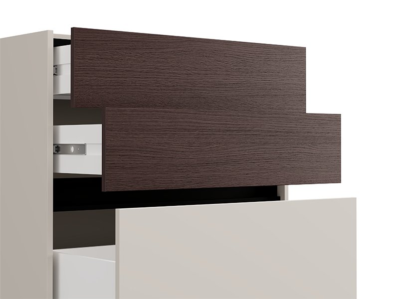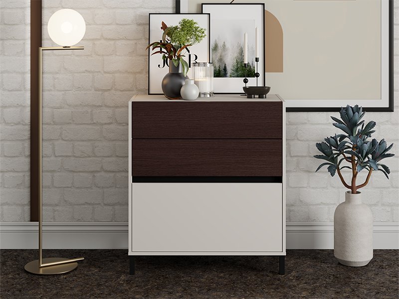 Komoda COLHIDA 80 3F, izrađena u kombinaciji tamnog tejlor hrasta, crnog i kašmir dekora, doprinosi elegantnom i kontrastnom izgledu spavaće sobe. Ovaj model poseduje tri fioke, dve gornje su pliće, a najniža dublja, što omogućava pregledno i praktično odlaganje garderobe i sitnih predmeta. Komoda COLHIDA 80 3F deo je istoimene kolekcije za uređenje spavaće sobe COLHIDA, moderne i svedene dizajnerske forme sa kontrastnim detaljima.