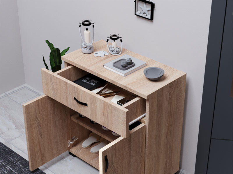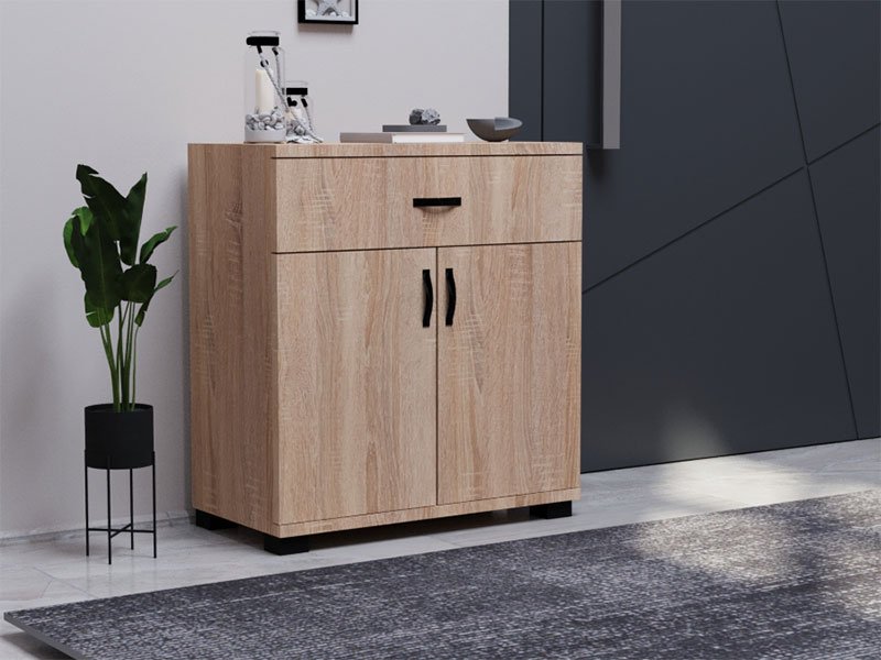 Tačan naziv dezena: konstrukcija / front iverica sonoma. Komoda LENY 2V1F se sastoji od kombinacije jedne fioke i zatvorenog pregradnog dela. Svojim estetskim karakteristikama lako se uklapa u ambijente doma u zavisnosti od toga gde vam je potrebno dodatno mesto za odlaganje.