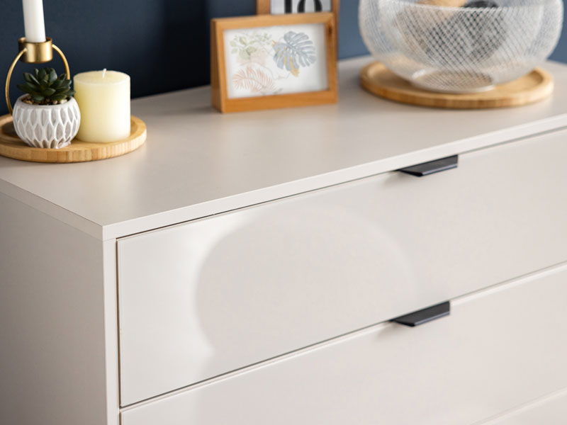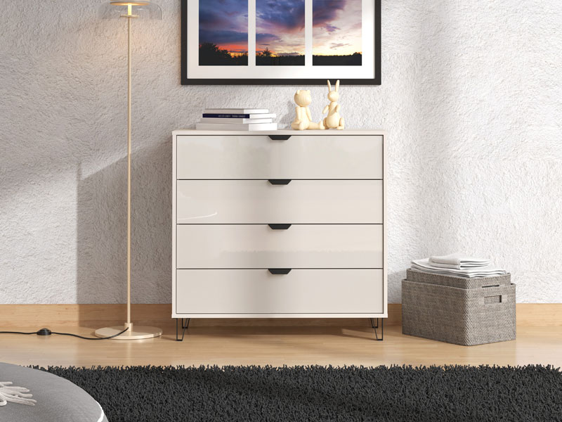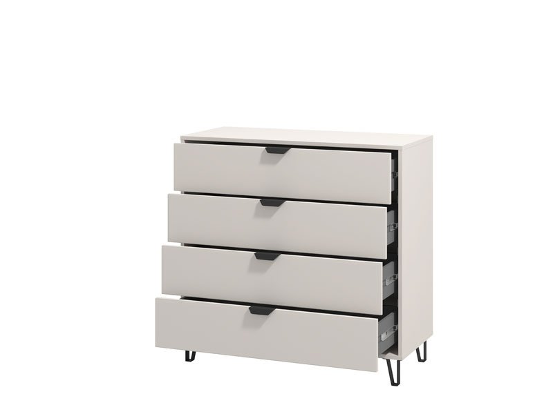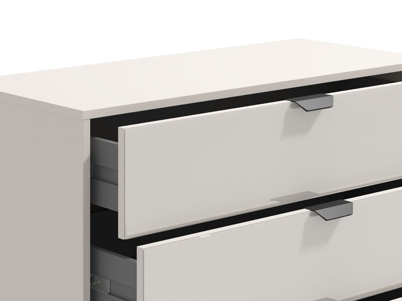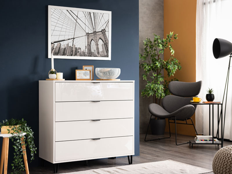 Komoda LUCCA 4F u kombinaciji kašmir dekora i kašmir bojenog stakla, predstavlja atraktivno i funkcionalno dizajnersko rešenje za opremanje savremenog ambijenta spavaće sobe.
