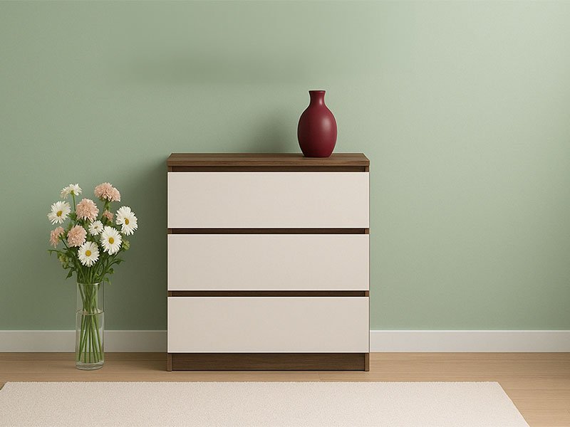 Tačan naziv dezena je : korpus iverica castello dark, front iverica kašmir. Komoda SEA 3F dizajnirana je tako da zahvaljujući upotrebnom prostoru koji obezbeđuju tri prostrane fioke, spada u elemente sa velikom upotrebnom vrednošću. Komoda SEA 3F je pogodna za opremanje predsoblja, dnevne zone ili spavaće sobe.