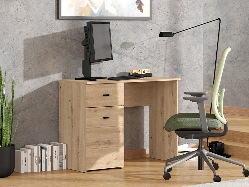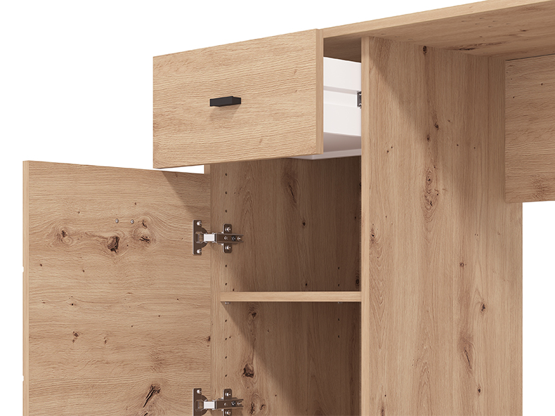 Kompjuter sto DIOFANT 1F1V, u dekoru artisan hrasta, odlikuje se minimalističkim i modernim dizajnom. Pored radne površine, upotrebni prostor čine i jedna manja fioka i pregradni zatvoreni deo, koji omogućavaju praktično odlaganje. Zahvaljujući kompaktnim dimenzijama i prirodnoj estetici drvo dekora, sto DIOFANT 1F1V predstavlja neizostavan element za funkcionalno i pregledno uređenje radnog prostora.