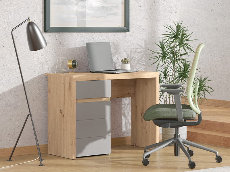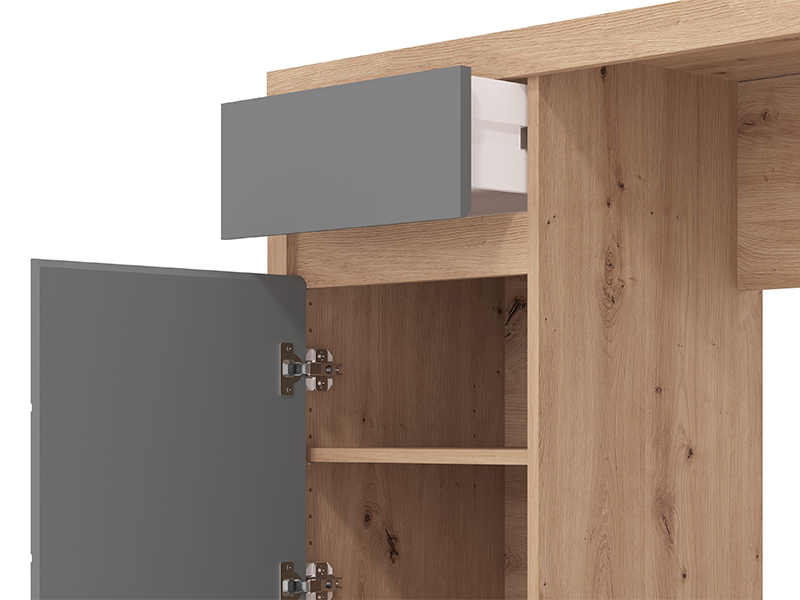 Kompjuter sto DIOFANT 1F1V LP izrađen je u kombinaciji dekora artisan hrasta, grafit sivog dekora i artisan hrast folije, odlikuje se modernim i elegantnim dizajnom sa frontovima bez ručica. Upotrebni prostor čine jedan zatvoreni pregradni deo i jedna fioka, koji omogućavaju pregledno i praktično odlaganje. Zahvaljujući funkcionalnoj organizaciji i estetski usklađenim dekorima, kompjuter sto DIOFANT 1F1V LP predstavlja neizostavan element za uređenje radnog prostora.