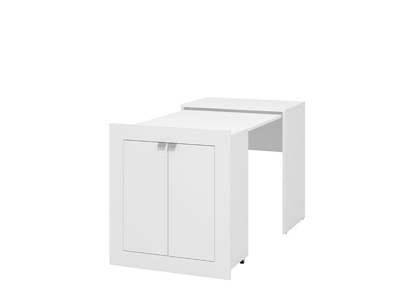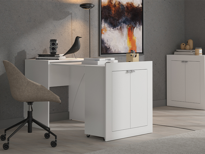 Kompjuter sto EUDOX, u opak belom dekoru, multifunkcionalan je komad nameštaja koji objedinjuje komodu i kompjuter sto. Deo komode se izvlači na točkićima, čime se brzo i jednostavno dobija dodatna radna površina. Ovaj praktičan sistem omogućava efikasno korišćenje prostora i lako prilagođavanje različitim potrebama. Zahvaljujući funkcionalnom dizajnu i neutralnoj estetici, sto EUDOX predstavlja moderan i praktičan izbor za organizaciju radnog prostora.
