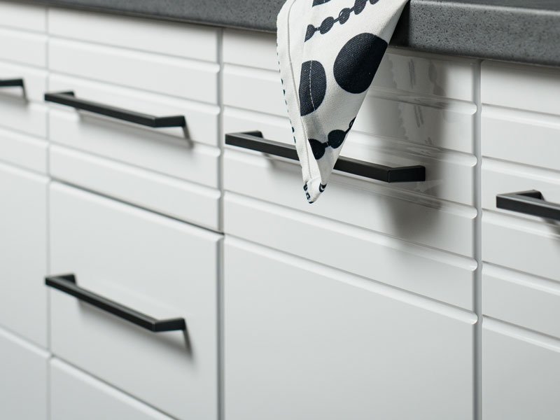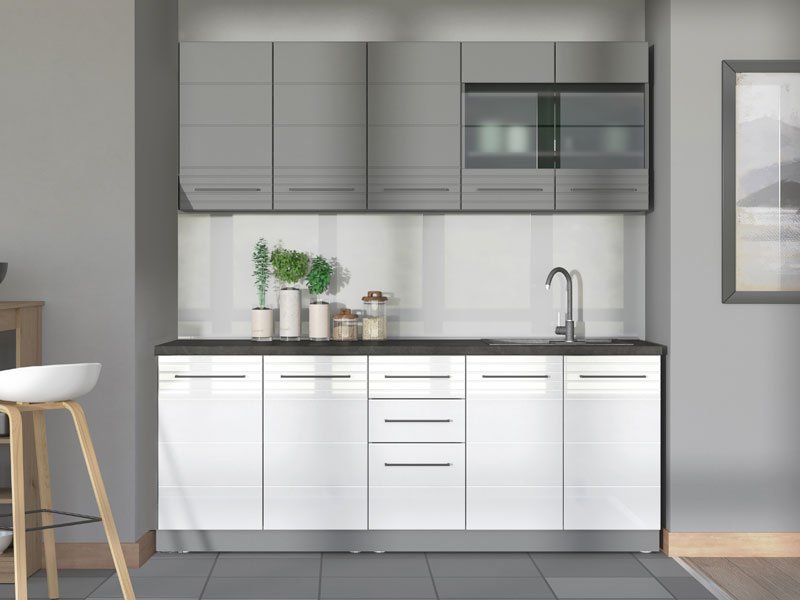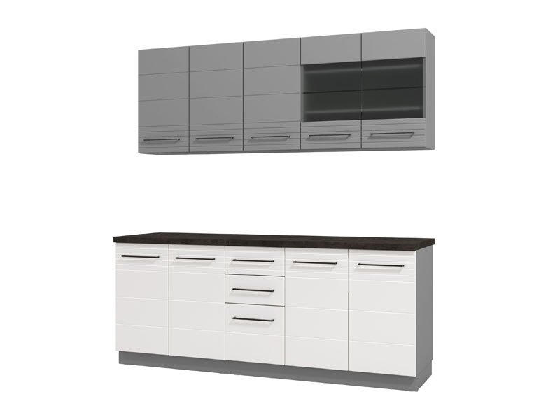 Kuhinja PETRA 200 predstavlja kompletno rešenje za uređenje kuhinjskih prostorija. Jedinstveni savremeni dizajn u kombinaciji grafit sive boje, bele lak i sive mat folije, zadovoljava estetske zahteve u uređenju svakog ambijenta. Poseduje praktično raspoređen prostor za odlaganje koji čine pregradni delovi u donjim i visećim segmentima, kao i dve fioke. Prilikom odabira nasadne sudopere za ovaj model kuhinje potrebno je odabrati radnu ploču od 28 mm, kako bi sudopera i radna ploča bile u ravni.