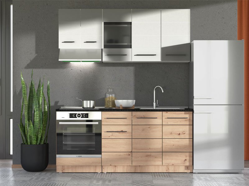 Kuhinja SAVONA 180, u opak belom i dekoru artisan hrasta, idealan je izbor za opremanje prostorija različitih dimenzija, a svojim dezenom koji je u skladu sa trendovima u enterijeru učiniće ambijent prijatnim i praktično organizovanim. Ovaj model kuhinje ima praktično organizovani upotrebni prostor. U okviru visećih pregradnih delova nalazi se i deo za ugradni aspirator, dok se u sklopu donjih kuhinjskih delova nalazi element za ugradnu rernu. Predstavljeni model kuhinje je bez sudopere i radne ploče.