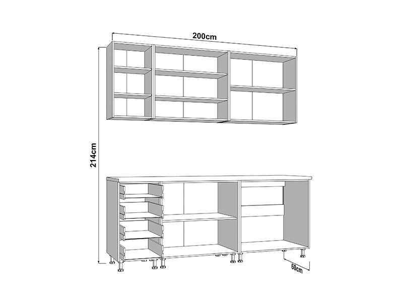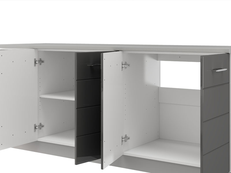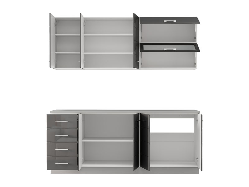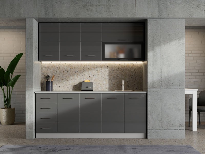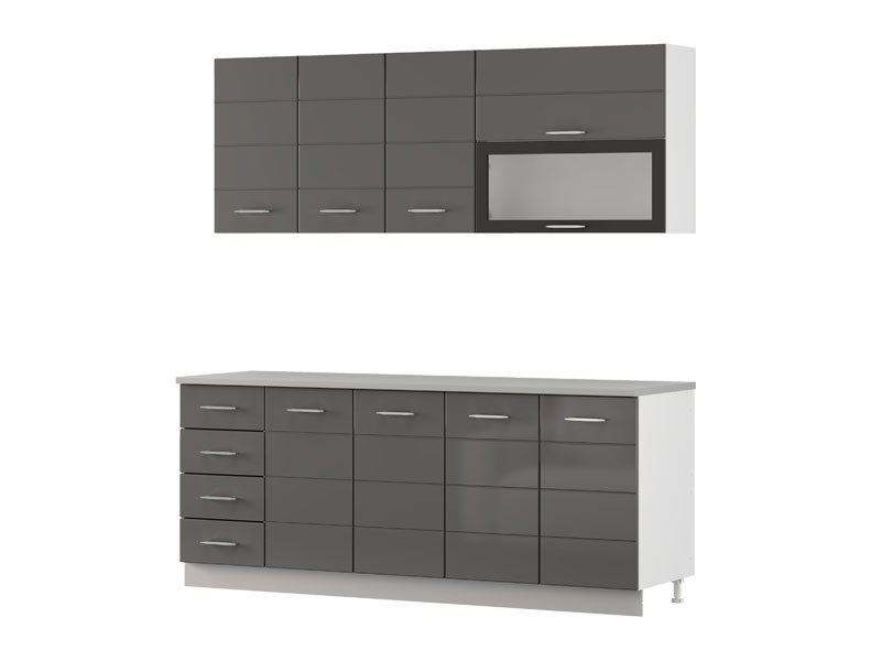 Kuhinja UNA 200, u kombinaciji opak belog dekora i sive lak folije, predstavlja elegantno i funkcionalno rešenje za moderne kuhinjske prostore. Praktično raspoređeni elementi omogućavaju efikasnu organizaciju i lako odlaganje kuhinjskog pribora, dok sveden dizajn, čistih linija i neutralnih tonova doprinosi svetlom i urednom ambijentu. Kuhinja se isporučuje bez radne ploče, sudopere i sokle, a ukupna dubina sa radnom pločom iznosi 60 cm, što omogućava racionalno planiranje prostora i svakodnevnu praktičnu upotrebu.
