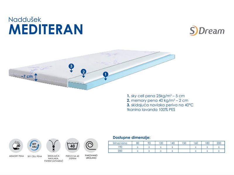 Naddušek MEDITERAN sastoji se od anatomske Memory pene 2 cm i sky cell pene 5 cm.Poseduje antibakterijsku skidajuću navlaku koja je periva na 40s tepeni, te je odlično rešenje za sve uzraste, kao idealna podloga za spavanje. Preporučuje se za starije ležajeve i tvrde podloge ležajeva.Dostupnan u više dimenzija. Naddušek se isporučuje urolan; dozvoljeno je odstupanje u visini do ±5 mm, u širini i dužini do ±10 mm 48 sati od otvaranja. Ova tolerancija je u skladu sa proizvodnim standardima i ne utiče na udobnost ni kvalitet korišćenja proizvoda. Svaki naddušek koji je isporučen urolan dostiže svoju punu dimenziju 72h od otvaranja.