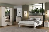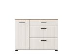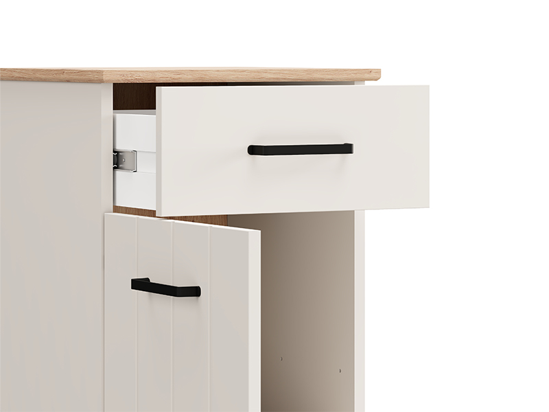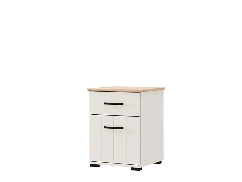 Noćni ormarić LAMBETH NO1F1V, izrađen u kombinaciji kašmira i artisan hrast dekora, doprinosi toplom i rustičnom izgledu spavaće sobe, naglašavajući jasno definisanu geometrijsku liniju dizajna i utisnute pruge na frontovima.