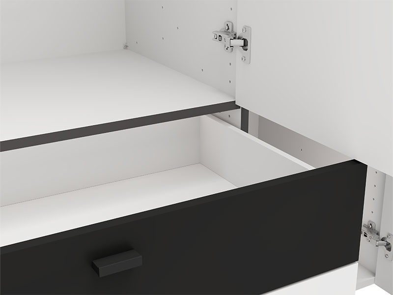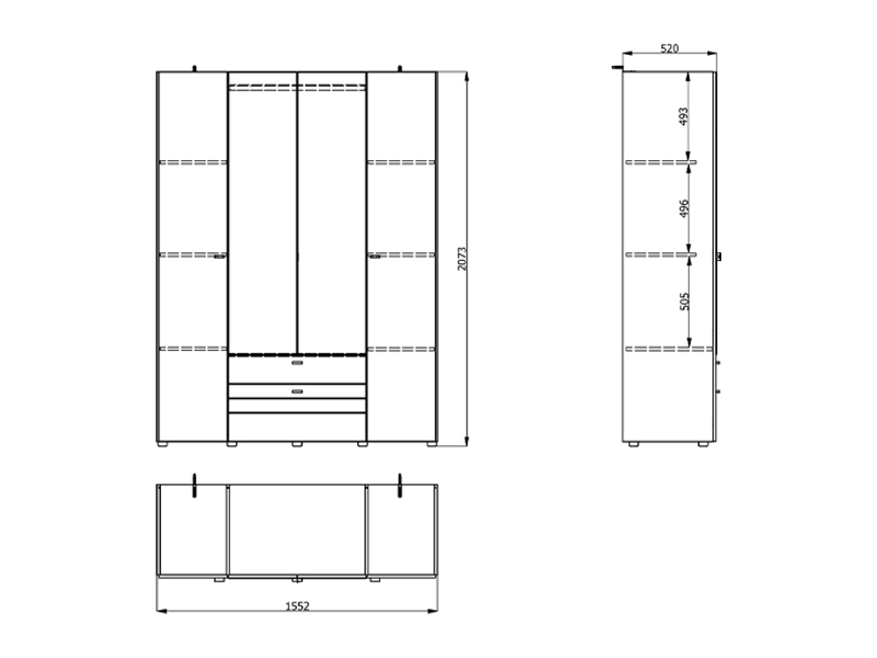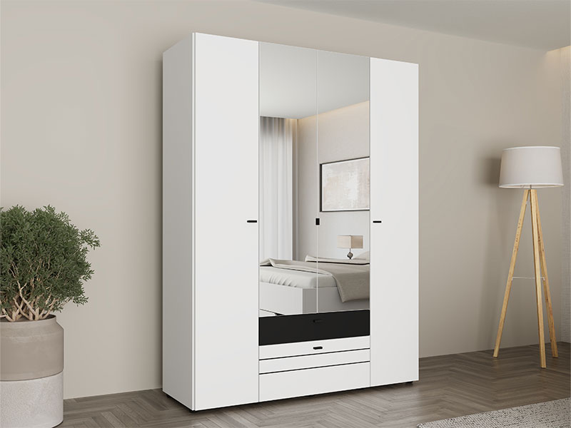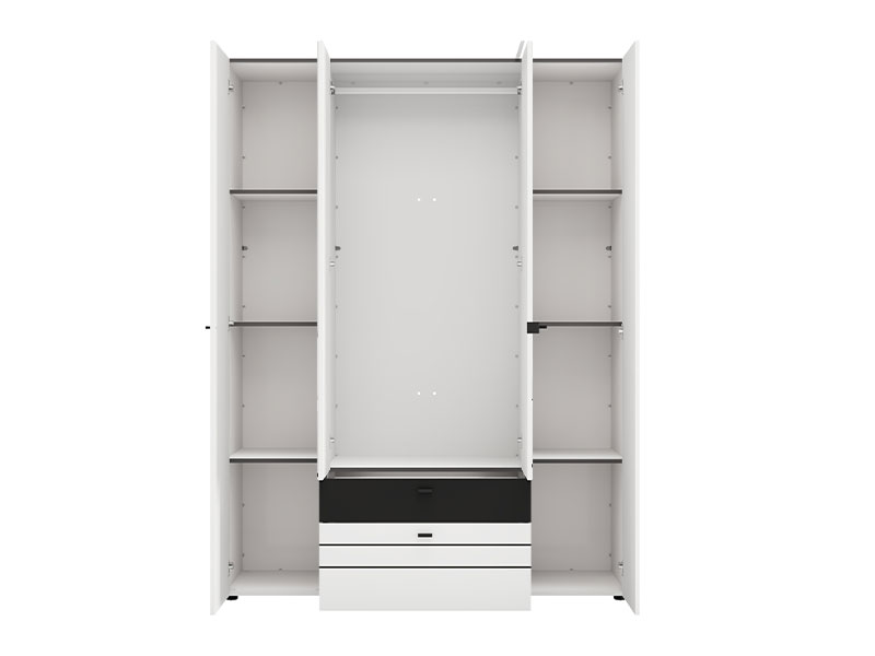 Upotrebni prostor četvorokrilnog ormara organizovan je kroz centralni deo sa garderobnom šipkom za odlaganje odeće, dok levi i desni deo predstavljaju zatvorene pregradne segmente, namenjene preglednom skladištenju garderobe i dodataka. Ormar takođe poseduje dve fioke za sitnije predmete.