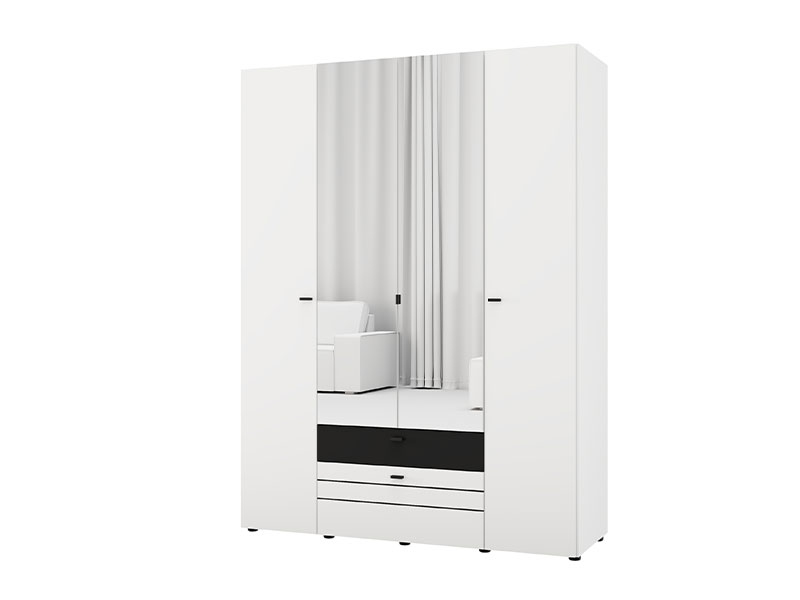 Ormar BITINIA 4K2F2O h207, izrađen u kombinaciji opak bela i crnog drvo dekora, doprinosi modernom i elegantnom izgledu spavaće sobe, naglašavajući upečatljiv kontrast materijala. Dva ogledala na centralnim frontovima dodatno unapređuju funkcionalnost i vizuelno proširuju prostor.