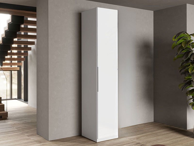 Tačan naziv dezena: korpus iverica bela, front iverica bela sjaj. Ormar BROOKLYN 1V je praktični model jednokrilnog ormara koji i sam može poslužiti za potpuno iskorišćenje prostora u ambijentima doma, mada potpunu funkciju ima tek u sklopu spavaće sobe BROOKLYN čiji je jedan element, važan za organizaciju prostora. Upotrebni prostor ormara BROOKLYN 1V čine dve garderobne šipke raspoređene na dve visine i središnja polica.