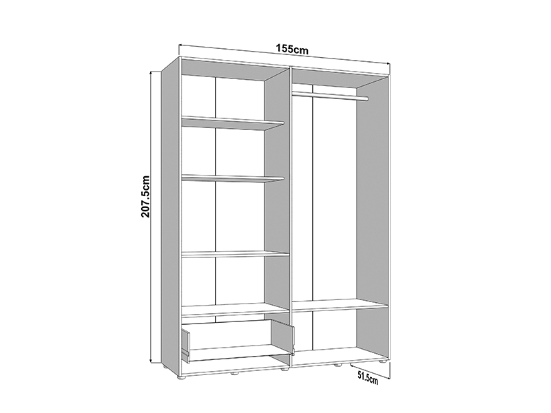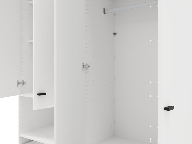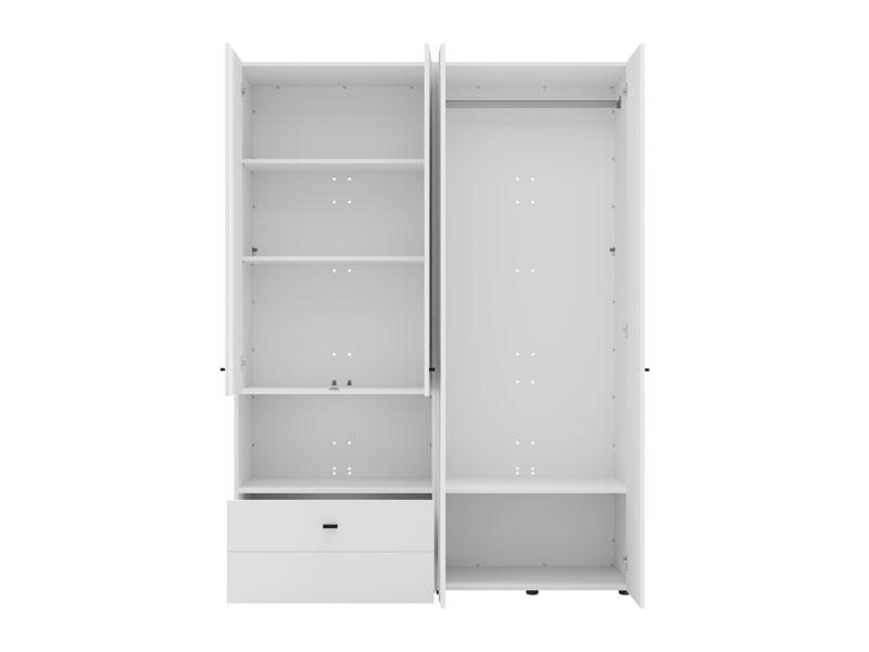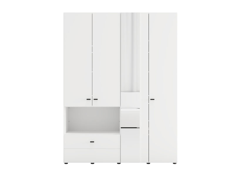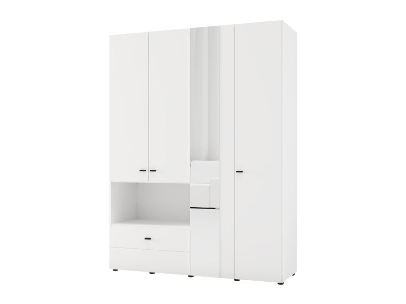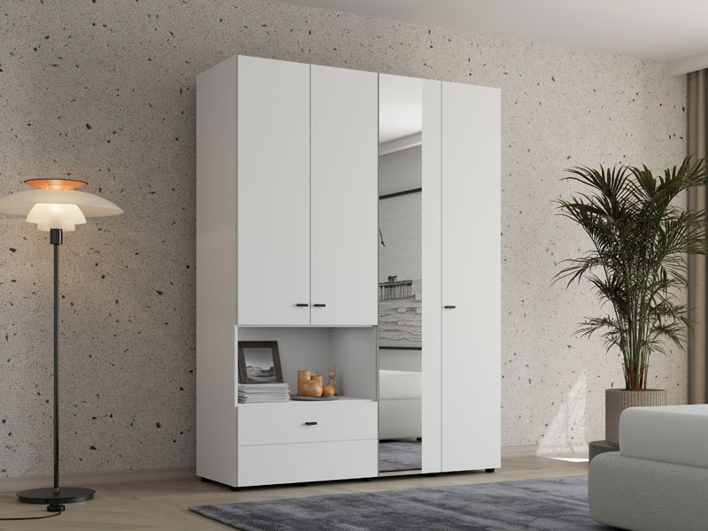Ormar CAMPSIE 4K1F1O h207, u opak belom dekoru, predstavlja moderno i elegantno rešenje za organizaciju garderobe. Ovaj četvorokrilni ormar ima jedan dvokrilni deo sa policama, jednom otvorenom policom i jednom dubokom fiokom, dok drugi dvokrilni deo sadrži garderobnu šipku. Jedno krilo ormara ima ogledalo, koje doprinosi praktičnosti, ali i estetskom utisku prostora. Upotrebni prostor se može dodatno proširiti dodavanjem seta polica, čime se povećava funkcionalnost unutrašnjeg prostora.