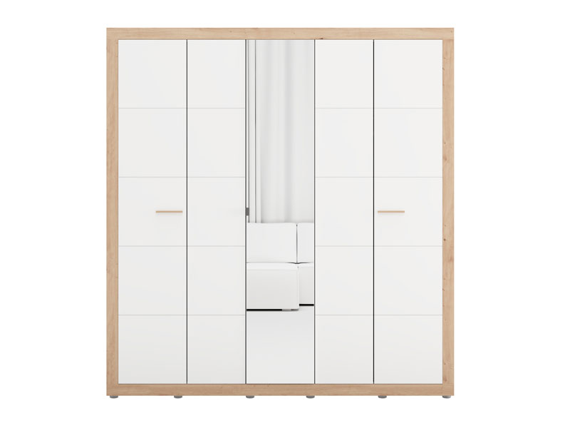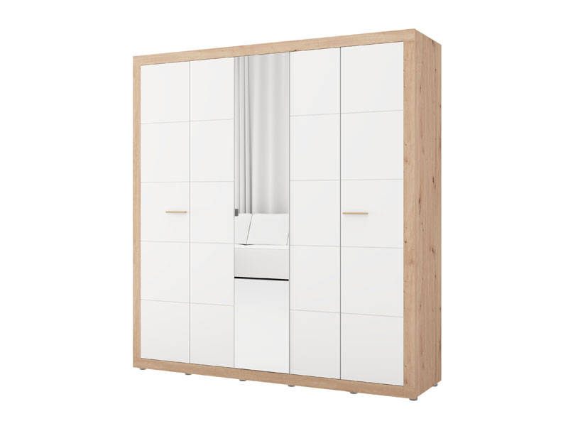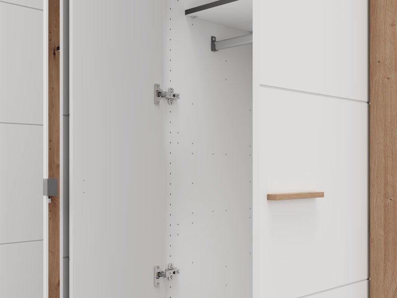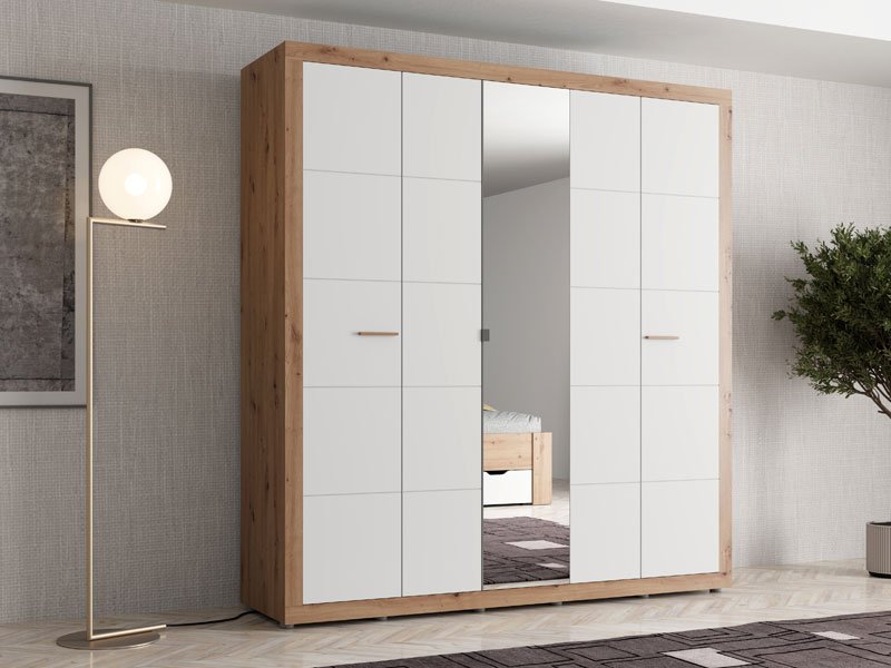 Ormar CARTENA 5K1O h207, izrađen u kombinaciji opak belog dekora, artisan hrasta i artisan hrast folije, doprinosi modernom i elegantnom izgledu spavaće sobe, ističući kontrast materijala i preciznu geometrijsku liniju dizajna. Centralni front ormara opremljen je ogledalom, koje dodatno unapređuje funkcionalnost i vizuelno proširuje prostor.