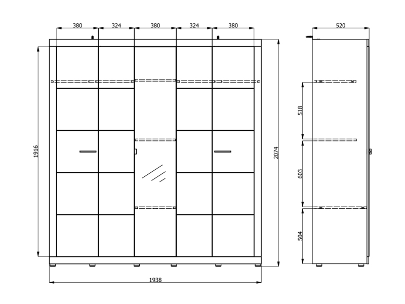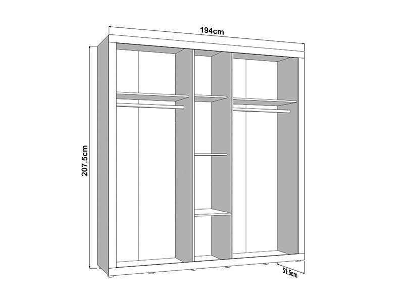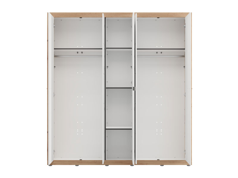 Upotrebni prostor petokrilnog ormara organizovan je tako da dva dvokrilna dela sadrže garderobnu šipku, dok je centralni deo opremljen policama, što omogućava pregledno i praktično odlaganje garderobe.