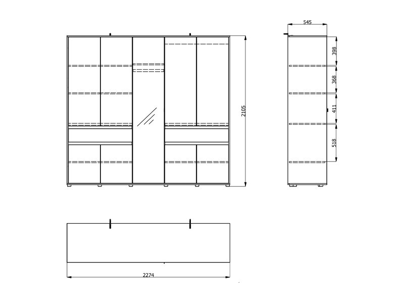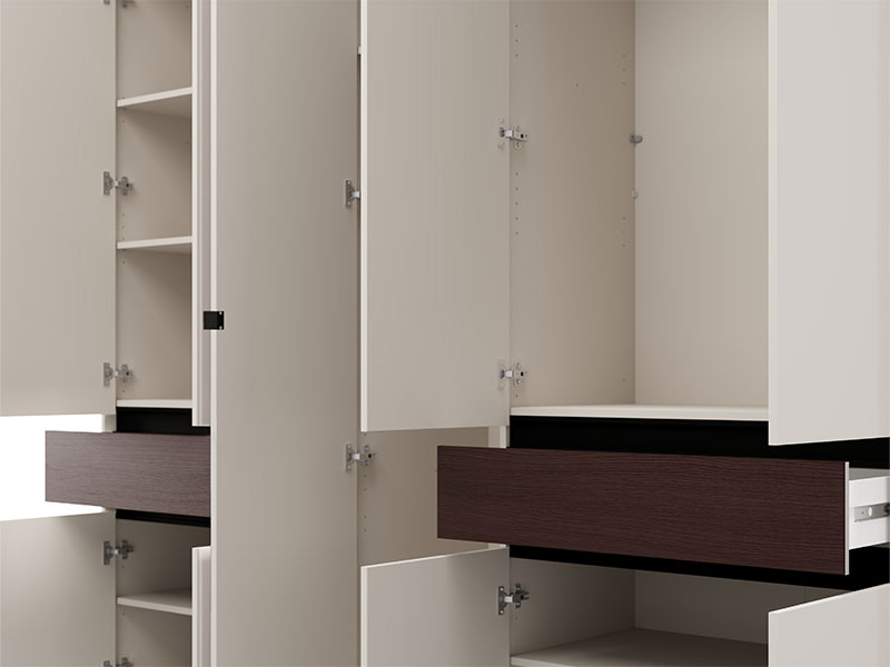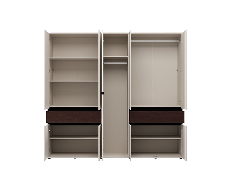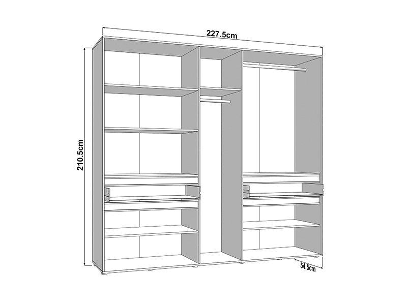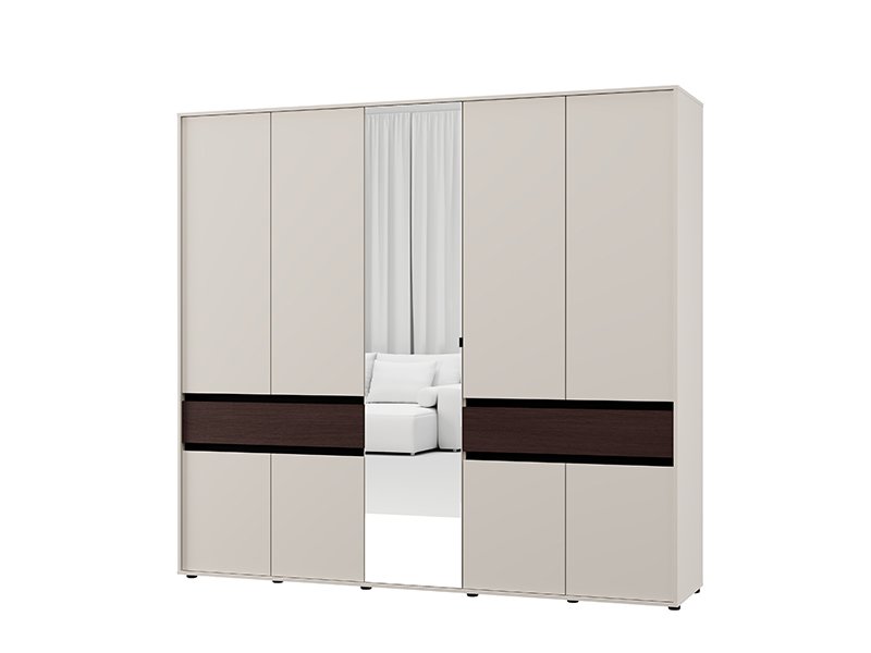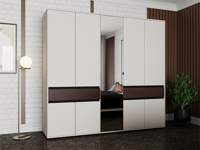 Ovaj petokrilni ormar opremljen je središnjim frontom sa ogledalom, dok upotrebni prostor čine garderobne šipke i pregradni delovi, uz dve praktične fioke, što omogućava pregledno i funkcionalno odlaganje garderobe i sitnih predmeta.